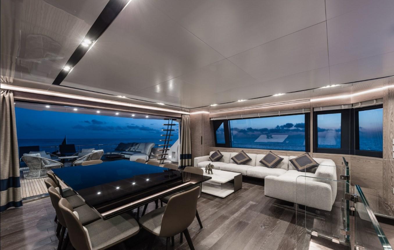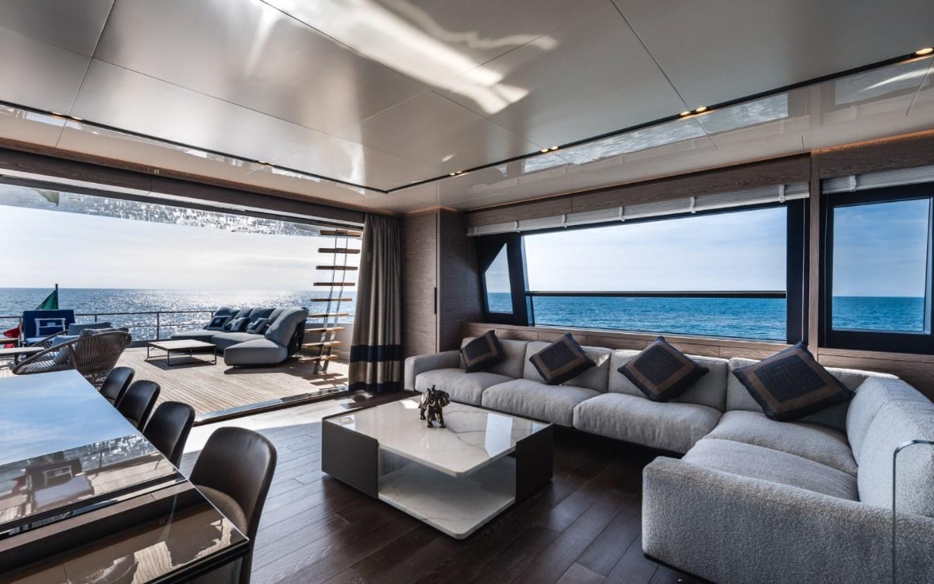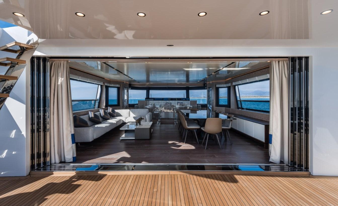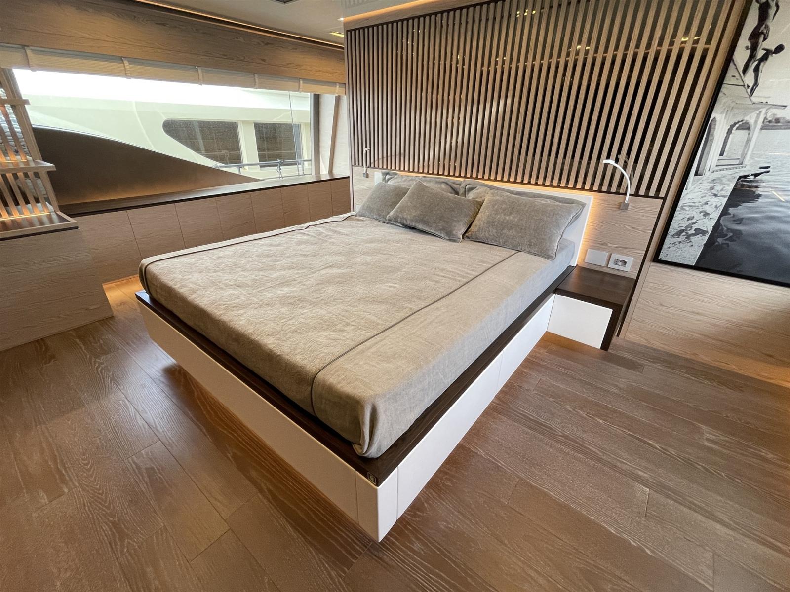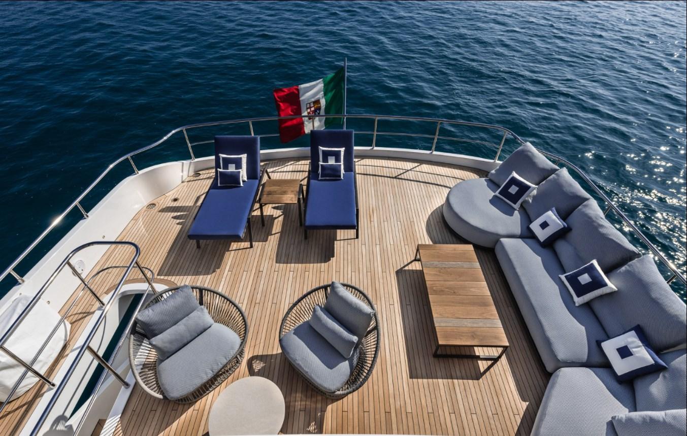 Maiora 30 Cabriolet . 30,60 mètres de long et 7,50 mètres de large permettent au Maiora 30 Cabriolet d’offrir des volumes impressionnants à la disposition de l’Armateur et de ses hôtes pour un bateau de cette catégorie. Maiora 30 Cabriolet entre dans la catégorie des bateaux de plaisance certifiés CE. Ce superyacht est appelé « convertible » pour la conformation particulière du pont supérieur, divisé en deux zones, l’une fermée et entièrement conditionnée, le Sky Lounge, et l’autre « an plain air » utilisable de différentes manières en fonction des besoins de l’Armateur. Le Sky Lounge est doté de vitraux latéraux entièrement abattables et d’une porte arrière amovible, de manière à pouvoir transformer confortablement un espace clos et réservé en un espace ouvert et aéré en communication directe avec l’espace extérieur.Le salon du Sky Lounge, d’environ 50 mètres carrés, est orné d’un mobilier sélectionné parmi les plus prestigieuses marques de meubles italiens et complété par de merveilleuses œuvres d’art.La salle est facilement transformable en faisant vivre des paysages toujours différents: elle peut être utilisée comme une salle de cinéma parfaite, où se détendre en regardant un bon film en compagnie ou comme une belle terrasse sur la mer, où vous pourrez vivre des moments de détente au coucher du soleil ou d’extrême liberté en regardant la mer, mais aussi comme salle à manger à déguster en toute intimité avec la famille et les amis. Le Maiora 30 Cabriolet se distingue par son confort et ses grands espaces. Grâce aux couloirs latéraux, tous les clients à bord peuvent marcher de l’arrière à l’avant de manière fluide et ininterrompue, offrant ainsi une expérience embarquée inoubliable. Tel est précisément l’objectif du célèbre chantier naval italien: accueillir les désirs et les besoins du client, pour lui offrir, ainsi qu’à tous ses clients, une expérience unique. Les fenêtres pleine hauteur du pont principal s’étendent le long du navire fortifié et illuminent le grand salon central qui se présente comme un endroit accueillant et élégamment meublé avec une disposition fonctionnelle et une décoration délicate et recherchée, fruit du travail de conception minutieux du centre de style du chantier en collaboration avec le studio torinese Fossati Design Bureau. Le salon donne directement sur le cockpit très spacieux: à la demande d’armateur précis, cette zone a été considérablement agrandie pour obtenir une salle à manger très étendue et équipée d’une table pouvant accueillir jusqu’à huit personnes, devenant ainsi une partie du bateau parfait pour partager des moments de convivialité: une véritable salle à manger « au frais ». Le niveau de personnalisation s’élève jusqu’à la petite plage arrière abritant un sauna au niveau de la mer: les clients peuvent se détendre dans la chaleur d’un véritable sauna « flottant » et un instant plus tard, en quelques pas simples, plonger dans l’eau rafraîchissante de la mer. Toujours sur le pont principal, nous trouvons la cabine armatoriale, accueillante, lumineuse et caractérisée par un design sophistiqué et élégant. La douche du bain d’armateur, lumineuse et ornée de marbres aux murs, peut servir de bain turc pour un meilleur confort de l’armateur exigeant. Dans le lower deck, vous accédez aux cabines d’hôtes, 2 grandes cabines VIP et 2 cabines doubles, toutes avec salles de bains privatives. Sur le même pont, mais accessibles par des itinéraires dédiés, les confortables logements d’équipage se composent de 3 cabines et 2 salles de bains, pour un total de 5 lits. La timonerie est complète et importante, avec ses cinq moniteurs de 24 po et son électronique Furuno, comme la planche de commande de navires de plus grande taille.Les deux moteurs MTU 16V2000M96L de 2600 ch permettent chacun d’atteindre une vitesse maximale d’environ 27/28 noeuds. Pendant la navigation, le confort est toujours élevé, tout en conservant un silence et une stabilité constants et excellents, garantis par les normes de construction et les nageoires stabilisatrices efficaces, fonctionnant à la fois à l’ancre et à la navigation. Le garage est situé latéralement et peut accueillir un appel d’offres de 6 mètres, caractéristique unique de ce bateau.Equipement électronique de navigation:Indicateur d'angle de barre, GPS (FURUNO NAVIGATION EQUIPMENT PACKAGE), Radar (FAR 2238).Equipement de pont:Alarme de pompe de cale, 2 Ancre, Eau sous pression, Passavant en teck, Douche de cockpit, Double barre à roue (terza stazione comandi), Phare de poursuite, Flaps hydrauliques, Garage à annexe (laterale), Bossoirs, Grue pour jet-ski (a prua), Bossoirs pour annexe (a prua), Hard top, Extincteur(s) fixe(s), Lavage de chaine, Plateforme arrière, Pompe de cale automatique, Pompe de cale manuelle, Porte latérale, Porte latérale, Cockpit en teck, Prise de quai, Connexion eau sous pression à quai, Onduleur, Répétiteur électronique, 2 Guindeau électrique, Echelle de bain, Stabilisateurs (zerospeed), Annexe (WILLIAMS 565 JET), Winch électrique arrière, Winch électrique avant.Equipement intérieur:BBQ/ Grill, Ballon d'eau chaude, Air Conditionné, Connexion à internet, Contrôleur domotique, Dessalinisateur, Cuve à eaux noires, Prises interieures 220v, Caméra vidéo, 8 Toilettes électriques.Divers:Antenne satellite TV, Hi-Fi.Equipement de confort:Sèche linge, Cuisine, Réfrigérateur extérieur, Machine à glaçons, Lave-vaisselle, Plaque vitrocéramique.Sellerie et tauds:Sellerie complète, Sellerie de fly, Taud de soleil.Notes équipement:TROISIÈME STATION DE COMMANDE, STABILISATEUR ZEROSPEED ET UNDERWAY, WATERMAKER 360 LITRES/HEURE. SAUNA