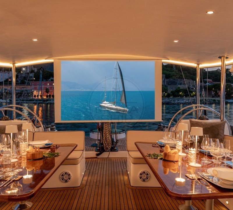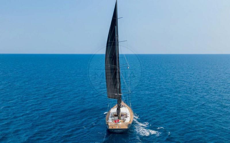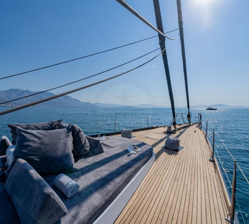 La goélette Steel Motorsailor 34MT est un voilier à coque d’acier construit en 2007 par le célèbre chantier naval Mastori Yachts à Bodrum, en Turquie. Ce yacht de 34 mètres combine l’élégance classique des bateaux turcs traditionnels avec un design contemporain et des solutions techniques modernes. Construite selon les normes RINA et IACS, la coque garantit solidité et sécurité lors de la navigation. Avec 592 m² de surface de voilure et deux moteurs MAN de 440 CV, il offre une navigation en douceur aussi bien à la voile qu’au moteur, avec des vitesses de croisière de 10 nœuds et un maximum de 12,4 nœuds.Conçue pour accueillir jusqu’à 10 personnes dans 5 cabines luxueuses, la goélette offre également des quartiers séparés pour l’équipage. Les extérieurs font partie de ses points forts : le pont arrière abrite un grand espace repas extérieur avec une grande table et des sièges rembourrés, parfaits pour les dîners conviviaux. Les larges passages latéraux mènent à un pont avant spacieux et plat, meublé de chaises longues et d’un coin salon confortable, idéal pour se détendre ou organiser des fêtes sous les étoiles. Les espaces extérieurs sont complétés par un solarium dédié aux bains de soleil et un second coin salon à l’avant, parfait pour les moments de calme.Équipée de nombreux équipements de sports nautiques, d’annexes et d’une technologie moderne, la goélette allie le charme de la tradition au confort contemporain. C’est le choix idéal pour ceux qui veulent faire l’expérience de la mer avec style, sans sacrifier le luxe, la sécurité et la liberté.Les intérieurs du Steel Motorsailor 34MT offrent un environnement sophistiqué, spacieux et accueillant, conçu pour assurer un maximum de confort et de détente à bord. Le décor se distingue par son style sobre et contemporain, qui rompt avec le design traditionnel de la marine lourde. Des bois précieux tels que l’acajou, des plafonds recouverts de contreplaqué marin certifié et des sols en marbre et teck confèrent à l’environnement chaleur et raffinement. L’éclairage indirect et les tons neutres créent une atmosphère relaxante, élégante et lumineuse.Le cœur de l’intérieur est le salon principal, grand et bien meublé, avec des canapés confortables, une table à manger et une télévision rotative à 360 °, également visible depuis le pont arrière. L’espace nuit comprend cinq cabines d’invités : une suite propriétaire de 50 m² avec un lit king-size, une salle de bains privative en marbre avec grande douche à l’italienne, et quatre cabines doubles avec salles de bains privatives. L’une des cabines peut être combinée avec la suite du propriétaire pour former une suite familiale, idéale pour les parents avec enfants.Chaque cabine est décorée d’œuvres originales du peintre turc Ali Atmaca. Les salles de bains sont équipées de robinets Grohe, d’appareils sanitaires Geberit et de revêtements en marbre, offrant un niveau de luxe comparable à celui d’une suite d’hôtel.La cuisine est entièrement équipée avec des appareils Arcelik et Vestel, y compris : réfrigérateurs, congélateurs, four double, grill, micro-ondes, machine à laver, sèche-linge, machines à café (filtre, turque, Nespresso), presse-agrumes et machine à glace (Neta, 2016).Un véritable environnement résidentiel en bord de mer, élégant, fonctionnel et plein de confort.Equipement électronique de navigation:AIS (SIMRAD), Indicateur d'angle de barre, Antenne radar, Compas (FLUXGATE), Commande électrique, Ordinateur fixe de bord, Compteur de chaîne, Montre de bord, Moniteur, DSC VHF, Sondeur pêche (SIMRAD), Ordinateur de bord, Interphone, Plotter GPS, Jumbo, Siège copilote, Sondeur, Téléphone satellite, Yacht controller.Equipement de pont:Alarme gaz, Alarme moteur, Alarme de pompe de cale, Ouverture du compartiment moteur électrique, Ligne d'arbre de rechange, Eau sous pression, Trim hydraulique, Enrouleur pour cable électrique, Taquets pliants, Système de vidange, Passavant en teck, canoë, Douche de cockpit, Double barre à roue, Hélice de rechange, Phares fixes arrière, Phare de poursuite, Bossoirs, Extincteur(s) fixe(s), Compresseur de plongée, Lavage de chaine, Lavabo dans le cockpit, Éclairage de courtoisie, Spots sous-marins, Jet-ski, Moteur d'annexe, Passerelle, Plateforme arrière, Pompe de cale automatique, Pompe de cale manuelle, Pont en teck, Porte latérale, Porte latérale, Cockpit en teck, Prise de quai, Connexion eau sous pression à quai, Onduleur, Répétiteur électronique, Rollbar, Guindeau électrique, Guindeau Hydraulique, Guindeau manuel, Gréement en textile, Gréement monotoron, Echelle de coupée, Echelle de bain, Selles pour Annexe, Système de filtration des eaux usées, Stabilisateurs, table de cockpit, Annexe, Corne, Pont en teck, Winch hydraulique, Winch électrique arrière, Winch électrique avant, Windex.Equipement intérieur:Alarme intrusion, BBQ/ Grill, Ballon d'eau chaude (Elettrico), Coffre-fort, Air Conditionné, Connexion à internet, Gradateur de lumière, Dessalinisateur, Cuve à eaux noires, Plancher intérieur en bois, Prises interieures 12v, Prises interieures 220v, Broyeur à ordures, Réservoir d'eau noire, Interphone, Toilettes électriques.Equipement de sécurité:Baromètre, Jumelles, Fumigène, Cartes marines, Trousse à pharmacie, Gilets de sauvetage, Equipement sécurité jusqu'à 3 miles, Equipement sécurité jusqu'à 6 miles, Equipement sécurité jusqu'à 12 miles, Equipement sécurité jusqu'à 50 miles, Equipement sécurité au delà des 50 miles, Feux à main, Gilets de sauvetage, Fusées parachutes, Fusées de signalisation, Réflecteur radar, Bouée de sauvetage, Bouée fer à cheval et feu de retournement, Tableau à outils.Divers:Haut-parleurs, Décodeur satellite, TNT, Home cinéma, Mécanisme de levage de télévision, Ordinateur, Radio AM/FM, Lecteur VHS, Windsurf.Equipem