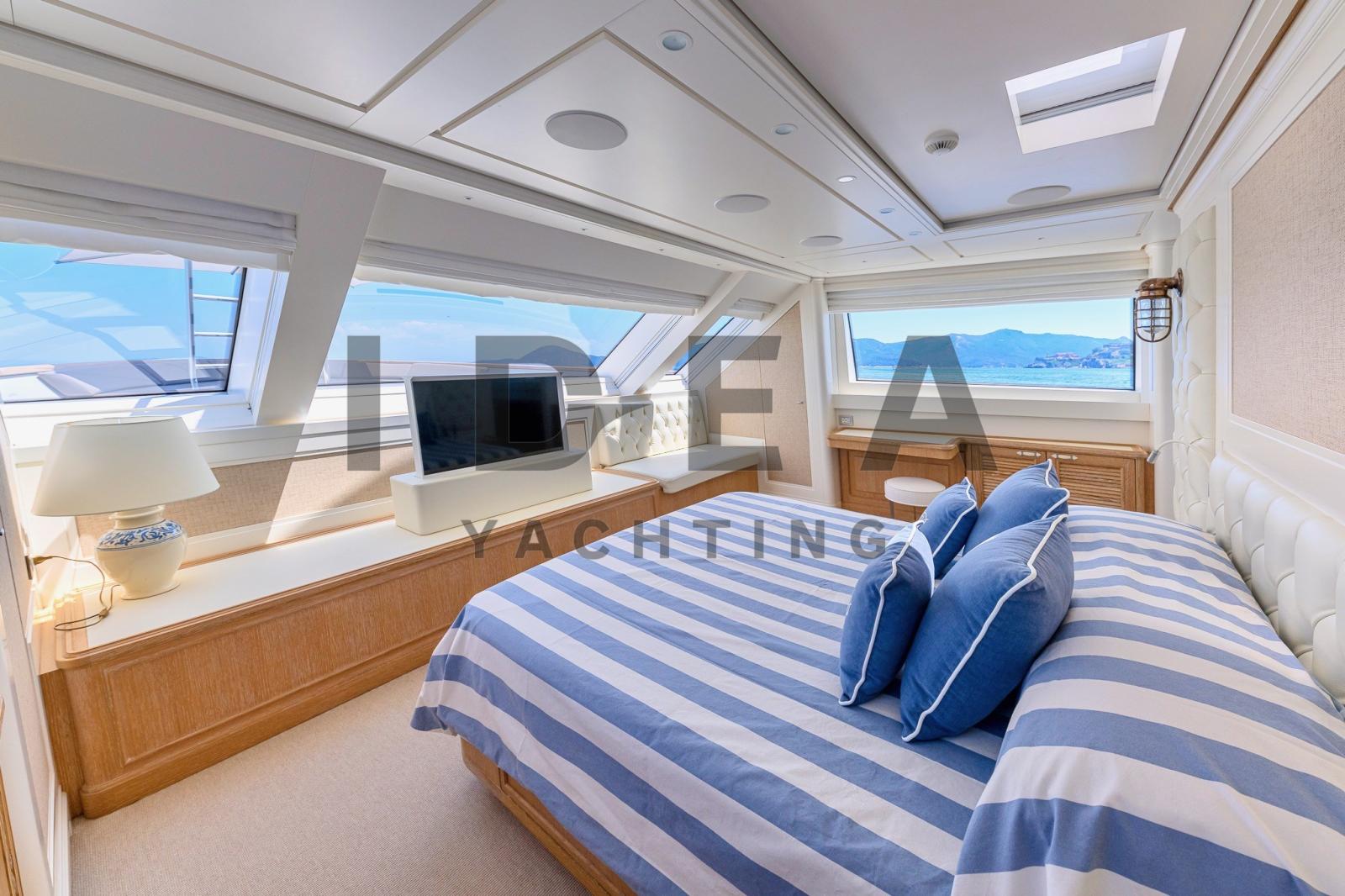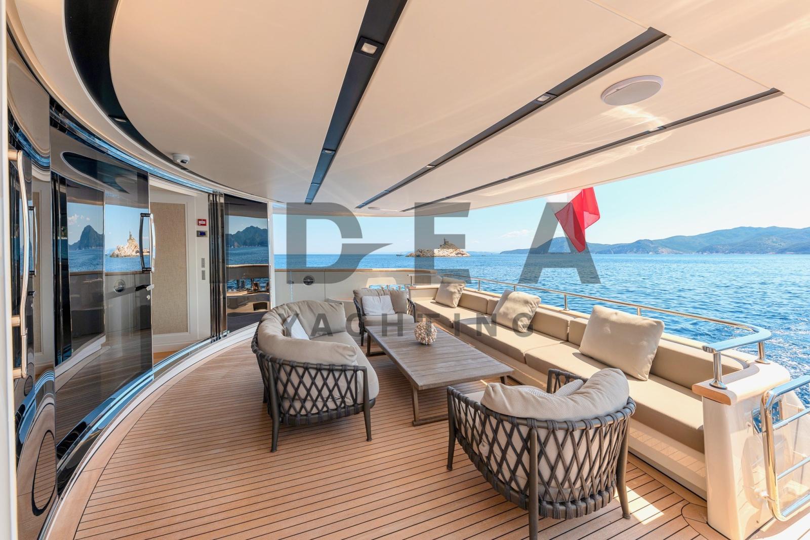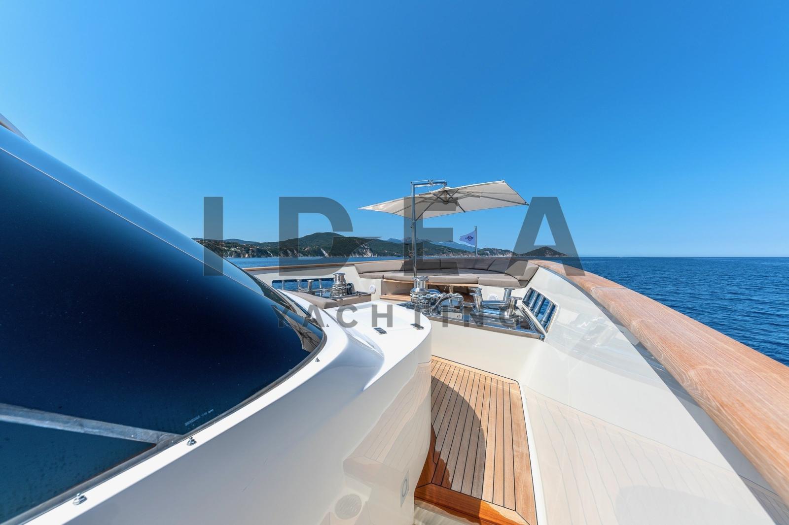 Très bon état généralJet d’eau KaMeWaLes reprises sont évaluéesPont principalHall d’entrée avec coin salon, avec canapé en L à gauche, canapé avec tables pliantes à tribord | Bar d’angle central derrière la timonerie avec toit panoramique | Salle home cinéma à l’avant avec TV 3D 60" qui se transforme en une 5ème cabine double avec canapé-lits et salle de bainPont inférieurSuite propriétaire au milieu du navire, lit king size, coin salon, télévision grand écran et salle de bain attenante | Cabine VIP à l’avant avec lit king size, coin salon, télévision grand écran et salle de bain attenante | Cabine invités avec lit double, télévision grand écran et salle de bain privée à tribord, entre la cabine VIP et la cabine principale | Cabine d’invités avec lits plats, autocar en option, télévision grand écran et salle de bain privée sur la gauche | Cabine équipage avec lits plats et salle de bain privée avec entrée indépendante depuis le coqueron avant | Cabine du capitaine avec lit simple, cabine de l’équipage avec lits superposés, cuisine et buanderie au milieu du navire et salle des machines à l’arrièreDevant l’entrée du salon principal, il y a des canapés d’angle des deux côtés avec deux tables et un canapé qui rejoint une grande terrasse le long de la poupe. Un escalier de chaque côté mène à la plate-forme de bain sur le pont inférieur. Des passerelles latérales mènent le long du pont principal jusqu’au pont avant, où se trouve un autre canapé en forme de C avec deux tables et de grandes chaises longuesSystème AV Crestron | Système stéréo surround B&OTV 42" dans le salon de pont | TV dans chaque cabine Home Cinéma avec écran 3D 60"iPod dans le salon de pont, la salle de télévision, la cabine principale et la cabine VIPFEUILLE EN COURS DE MISE À JOUREquipement électronique de navigation:AIS, Indicateur d'angle de barre, Antenne radar, Commande électrique, Ordinateur fixe de bord, Compteur de chaîne, Moniteur, DSC VHF, Plotter GPS, Siège copilote.Equipement de pont:Alarme gaz, Alarme moteur, Alarme de pompe de cale, Eau sous pression, Trim hydraulique, Passavant en teck, Douche de cockpit, Phare de poursuite, Flaps hydrauliques, Garage à annexe, Grue pour jet-ski, Bossoirs pour annexe, Hard top, Extincteur(s) fixe(s), Indicateurs de flaps, Lavabo dans le cockpit, Éclairage de courtoisie, Jet-ski (Seadoo 155 Hp), Passerelle (idraulica), Plateforme arrière, Pompe de cale automatique, Pont en teck, Porte latérale, 2 Porte latérale, Cockpit en teck, Prise de quai, Connexion eau sous pression à quai, Guindeau électrique, Echelle de bain, table de cockpit, Table pliante de salon, Annexe, Corne, 2 Winch électrique arrière.Equipement intérieur:Ballon d'eau chaude, Air Conditionné, Connexion à internet, Contrôleur domotique, Gradateur de lumière, Dessalinisateur, Cuve à eaux noires, Plancher intérieur en bois, Prises interieures 12v, Prises interieures 220v, Réservoir d'eau noire, 8 Toilettes électriques.Divers:Haut-parleurs, Home cinéma (Home Cinema with 60" 3D Screen), Radio AM/FM, Hi-Fi (B&O surround sound stereo system), 6 TV (salone, home cinema e nelle cabine).Equipement de confort:Cuisine, Réfrigérateur extérieur, Machine à glaçons, Lave et sèche-linge, Lave-vaisselle, Machine a café, Plaque vitrocéramique, Winecooler.Sellerie et tauds:Sellerie complète, Coussins arrieres, Coussin avant, sellerie de cockpit, Tauds de pare-brise.