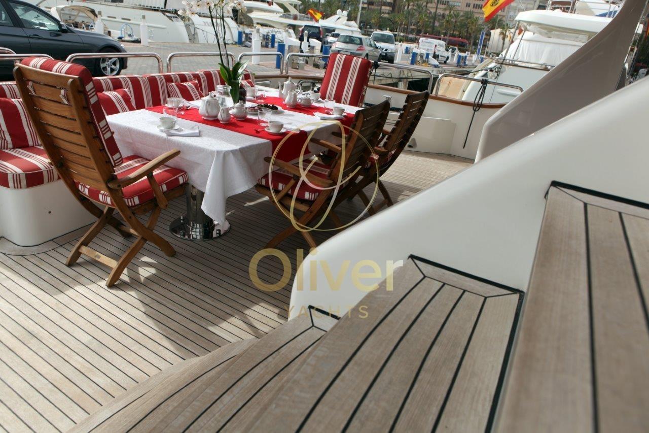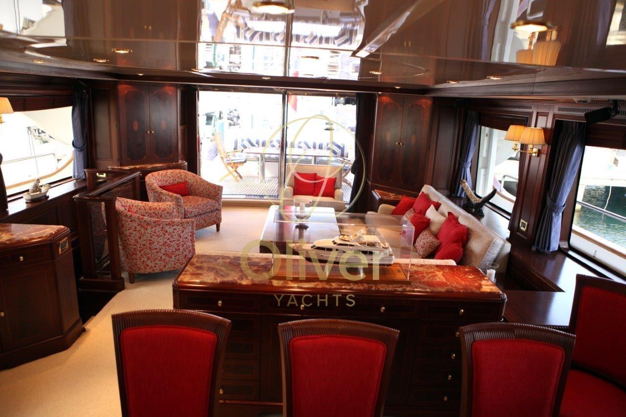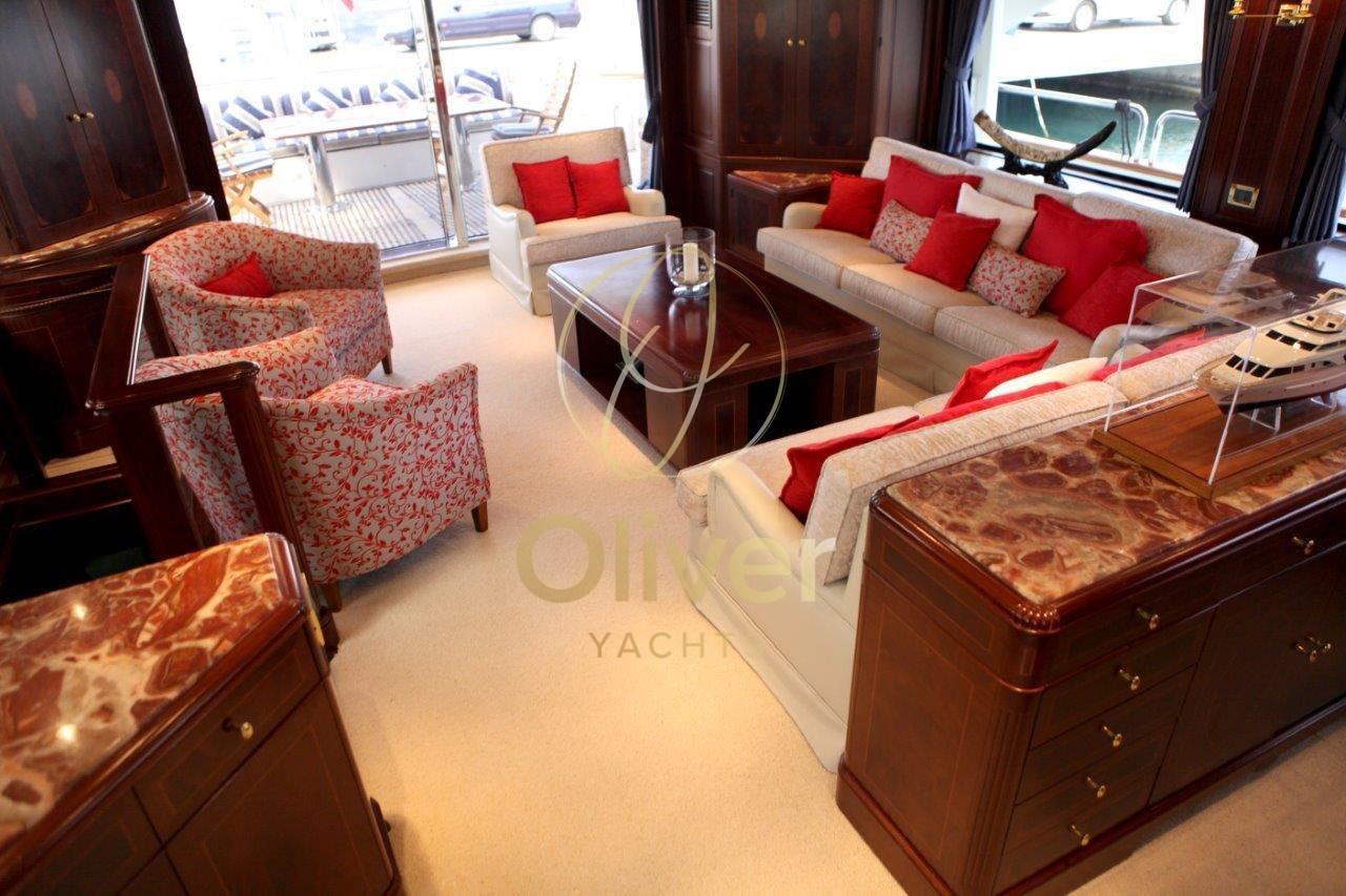 Bateau en excellent état général. Prêt pour la saison.Construit en Hollande par Porsius Shipyard B.V., il a été conçu par De Vries Lentsch.Les intérieurs sont bien entretenus et élégants. 2 réaménagements ont été effectués.La première, en 2007-2008, comprenait une remise à neuf majeure de la salle des machines, qui comprenait le remplacement de la plupart des composants principaux, y compris les génératrices, les systèmes de climatisation et la révision des moteurs principaux. Le deuxième carénage, qui a duré près de deux ans et s’est achevé en 2012, a impliqué une extension du tableau arrière de 3 mètres, l’ajout d’une plate-forme de bain intégrée, une extension du pont arrière couvert et du pont du bateau. Toutes les nouvelles cabines d’invités et les salles de bains ont été rénovées, nouvelle peinture et ponts en teck.Entrée par porte coulissante depuis le pont arrière. Salon très spacieux et confortable d’une hauteur de 1,97 m. Un grand canapé et deux chaises, une table de rangement qui peut également être utilisée pour des sièges supplémentaires, créant un espace de divertissement pour dix personnes. Le système de divertissement du salon comprend un téléviseur LED Sony Bravia de 42 pouces avec ascenseur électrique, un lecteur DVD Sony BluRay ; CD/radio Pioneer ; 4 haut-parleurs de 40 watts. Salle à manger à l’avant pour six personnes.Une salle de bains de service, avec un lavabo en marbre Blue Bahia, est située au centre du pont principal, dans le hall entre la suite du propriétaire et le salon principal et adjacente à l’escalier circulaire qui accède aux quartiers des invités et à la timonerie.Le bureau à tribord mène à la cabine du propriétaire. Le bureau est équipé d’une bibliothèque et d’un vélo d’appartement. Il y a de la place pour un bureau, précédemment retiré mais laissé sur le bateau.Grande cabine principale à l’avant avec 1,97 mètre d’espace pour la tête, un lit king-size avec des casiers généreux et amplement d’espace, une chaise et une coiffeuse. Nouveaux plafonds, éclairage LED et téléviseurs LED 32" en 2016. Grande salle de bain attenante avec lavabo en marbre (2012), douche à l’italienne avec banc (2016), W.C. et bidet. La climatisation avec système de ventilation à air frais complète la salle de bain.Trois cabines invités sur le pont inférieur, deux cabines avec un lit double et une cabine twin avec un lit pullman. Toutes les cabines disposent d’une salle de bains privative avec lavabo en marbre, de cabines de douche recouvertes de Corian avec incrustations de marbre. Chaque cabine est équipée de la climatisation avec échange d’air frais ; Hublots ouvrants, grandes unités murales et espaces de rangement. Les salles de bains ont des planchers en bambou et les cabines sont entièrement rembourrées.Cabine principale pleine largeur avec lit queen size, bureau, une armoire double et de grands tiroirs. Il y a un accès pour l’équipage pour le service derrière un miroir et une porte étanche.Deux cabines doubles pour les invités, un bureau et des cintres doubles pour armoires. La salle de bain privée, avec cabine de douche, lavabo en marbre Calcutta blanc et gris.Cabine d’invités avec lits jumeaux de 1,95 x 0,85 ; Table de chevet simple entre les lits et un lit pullman.Zone de l’équipage sur le pont inférieur avec accès depuis le pont principal et avec un accès supplémentaire dans la cloison arrière depuis les quartiers des invités. Couchages pour un total de quatre membres d’équipage. Il y a deux cabines : celle du capitaine dispose d’une couchette double et celle du marin dispose de 2 lits. Chaque cabine est équipée d’une cabine de douche, ainsi que de la climatisation.Les deux cabines ont été reconstruites en 2019 et la salle de bain et la cabine du capitaine en 2015.La salle à manger a été entièrement rénovée et rénovée en 2015/16 et comprend un petit évier, un réfrigérateur, un lave-vaisselle et des placards, la climatisation et la ventilation, une télévision 22 pouces avec lecteur DVD. Buanderie de l’équipage située à tribord du mess de l’équipage et équipée d’une laveuse et d’une sécheuse.Le grand pont arrière couvert a été entièrement reconfiguré lors de son carénage en 2012.Le nouvel aménagement est complètement à l’abri de la terrasse et comprend : canapé fixe de 10 pieds avec table à manger en teck peint et 4 chaises, bar avec réfrigérateur, évier et machine à glaçons.Plate-forme de bain avec porte pantographe étanche. Échelle de bain et garde-corps en acier inoxydable.Les grands ponts latéraux permettent un accès facile par l’équipage pour les opérations de nettoyage et d’entretien, tout en assurant aux propriétaires et aux invités un maximum d’intimité dans les zones réservées. Tous les ponts sont équipés de pavois et de couvercles en teck naturel non peints et/ou de garde-corps en acier inoxydable, le tout jusqu’à une hauteur de 1,0 m.Le pont avant, bien qu’il s’agisse principalement d’un pont de travail, dispose d’un coin salon isolé de 8 pieds ainsi que d’un espace de bronzage / détente à l’avant.Equipement électronique de navigation:AIS, Antenne radar, Commande électrique, Ordinateur fixe de bord, Compteur de chaîne, 2 Moniteur (monitor tvcc), DSC VHF, Interphone, Radar (elettrico GEM ARPA), Téléphone satellite.Equipement de pont:Alarme gaz, Alarme moteur, Alarme de pompe de cale, Eau sous pression, Système de vidange, Passavant en teck, Douche de cockpit, Double barre à roue, Grue de flybridge, Extincteur(s) fixe(s), Lavage de chaine, Éclairage de courtoisie, Passerelle (elettroidraulica), Plateforme arrière (poppa in teak), Pompe de cale automatique, Pompe de cale manuelle, Porte latérale, Porte latérale, Cockpit en teck, Prise de quai, Connexion eau sous pression à quai, Guindeau électrique, Echelle de bain, St
