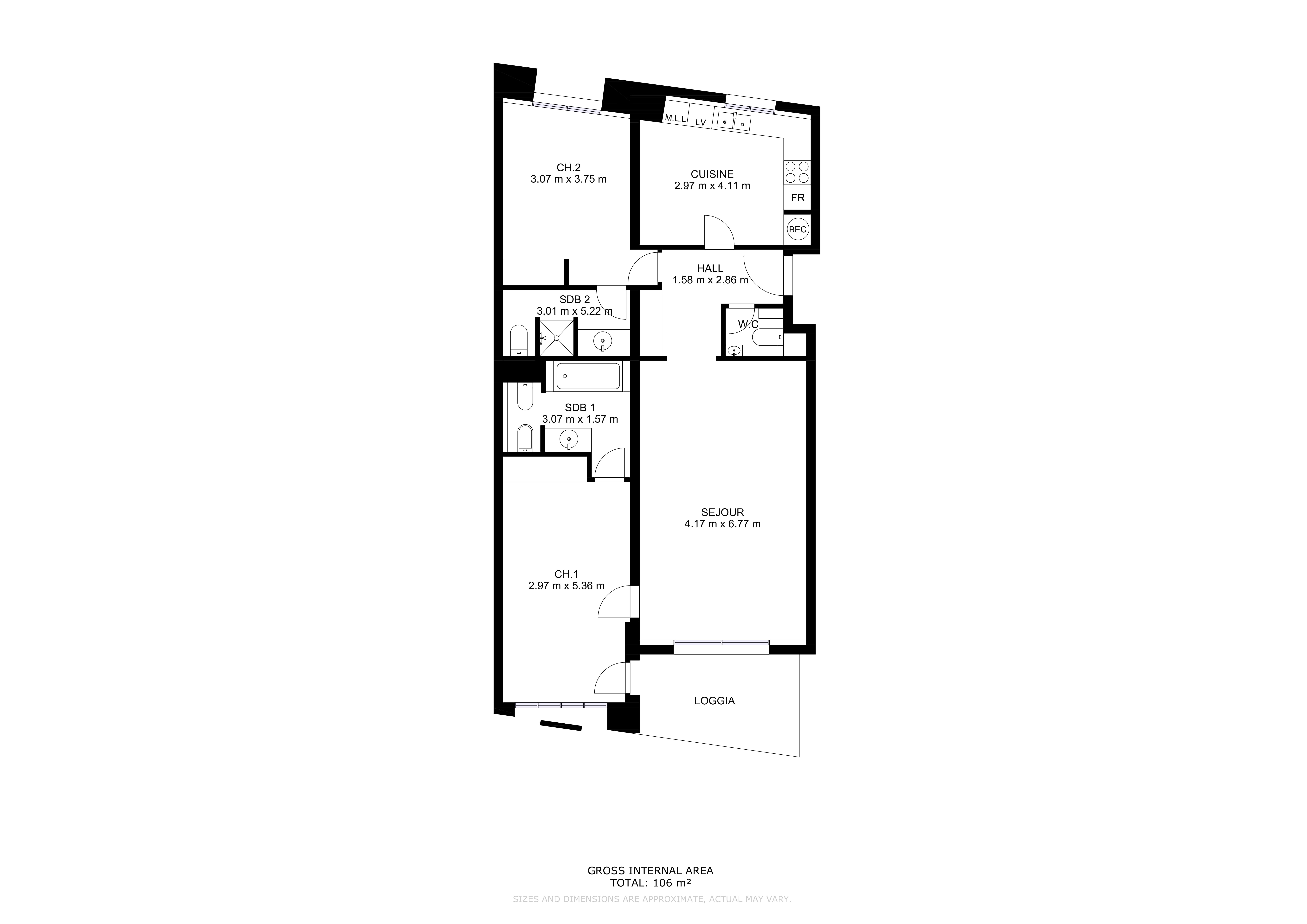 Il se compose actuellement d'un hall d'entrée, une grande cuisine indépendante, un spacieux séjour s'ouvrant sur une loggia, une chambre de Maître avec salle de bain en-suite et accès à la loggia et une seconde chambre avec salle de douche.