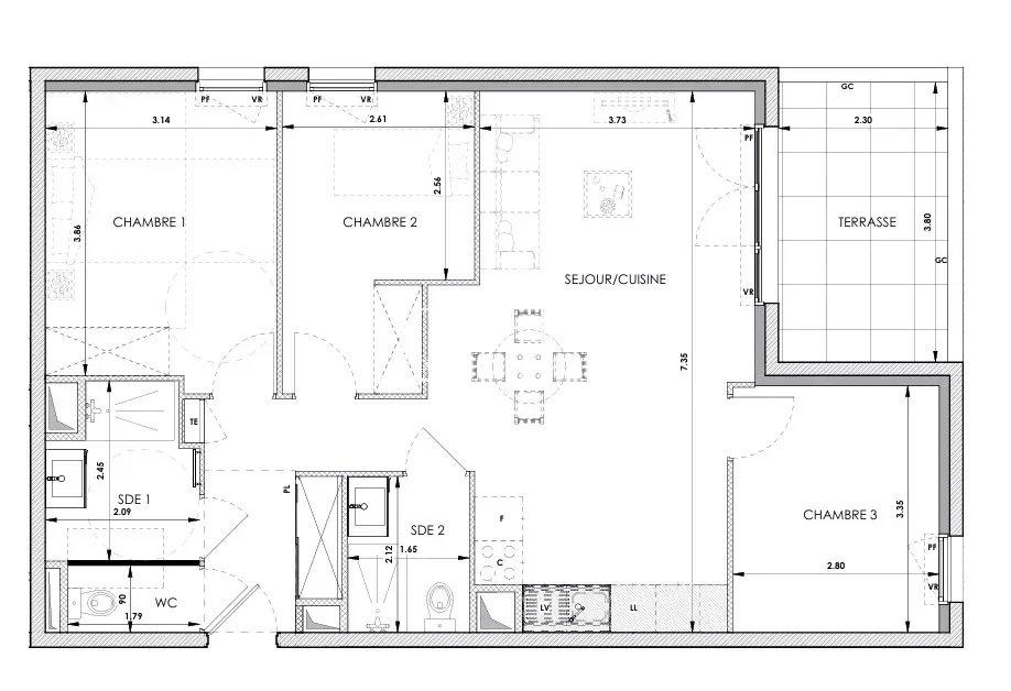 Cet appartement 4 pièces de 75 m² se compose d’une entrée, d’un séjour avec cuisine ouverte, de trois chambres, de deux salles d’eau, d’un WC indépendant, ainsi que d’une spacieuse terrasse de 48 m².
