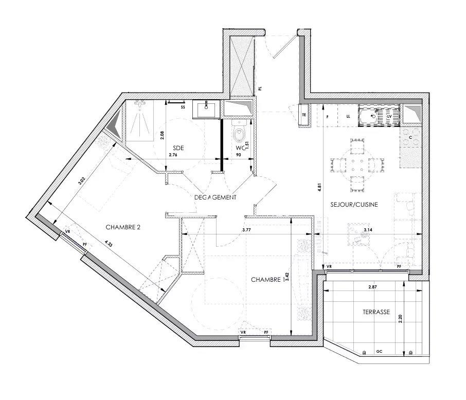 Cet appartement 3 pièces de 58 m², exposé plein sud se compose d’une entrée, d’un séjour/cuisine, de 2 chambres, d’une salle de douche, d’un toilette indépendant et d’une terrasse.