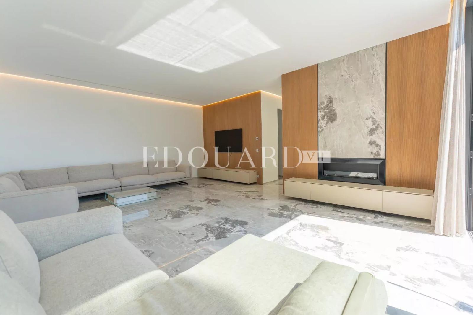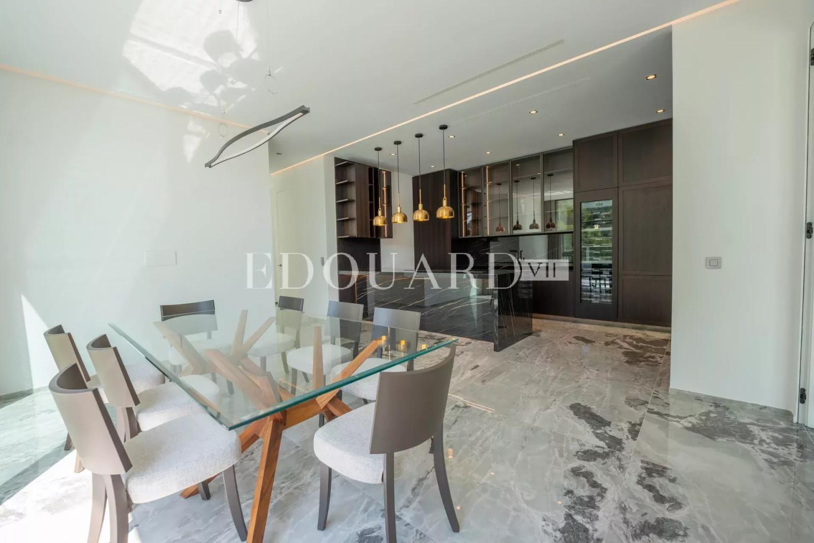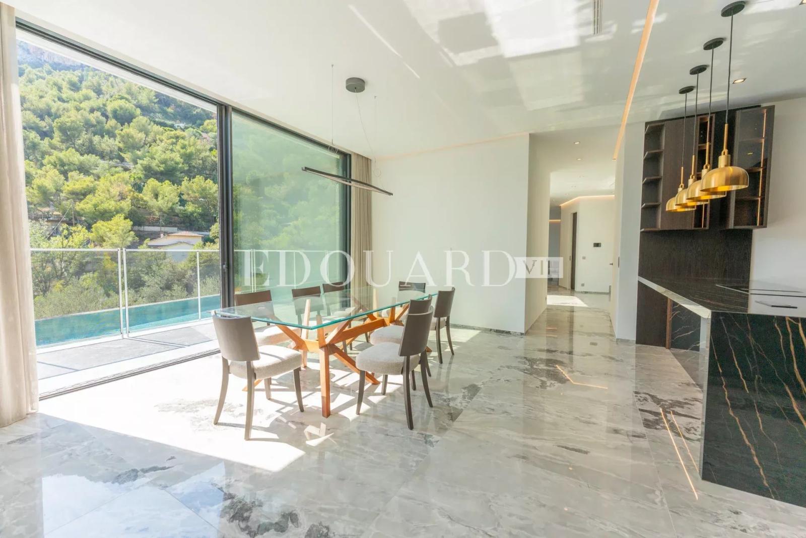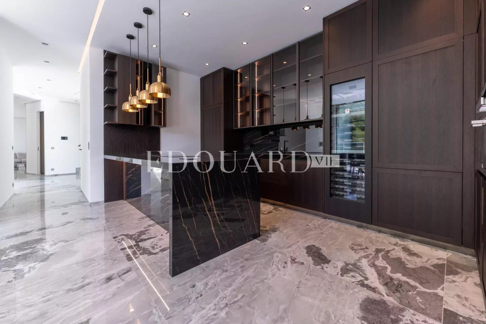 Sur la commune de Roquebrune Cap Martin, dans un quartier résidentiel proche de la Principauté de Monaco, à vendre en exclusivité villa neuve de 315 m² avec domotique, alarme, vidéosurveillance, porte blindée, climatisation réversible, chauffage au sol, ascenseur, escalier intérieur, piscine à débordement, jardin et belle vue mer panoramique. Construite sur 2.371 m² de terrain, cette splendide propriété se compose au niveau inférieur de spacieuse entrée, dressing, WC pour les invités, grand séjour très lumineux, salle à manger, cuisine indépendante complètement équipée, salle de sport, chambre avec dressing, salle de bains et WC séparé, buanderie, 121 m² de terrasse ; au niveau intermédiaire bureau, chambre de maître avec grand dressing, salle de bains, salle de douche et WC séparé, 2 chambres avec placards et salles de douche intégrées, 44 m² de terrasse ; au niveau supérieur 4 parkings couverts avec accès direct. Idéalement exposé Ouest et très ensoleillée, entouré de verdure et au calme absolu, produit excellent.
