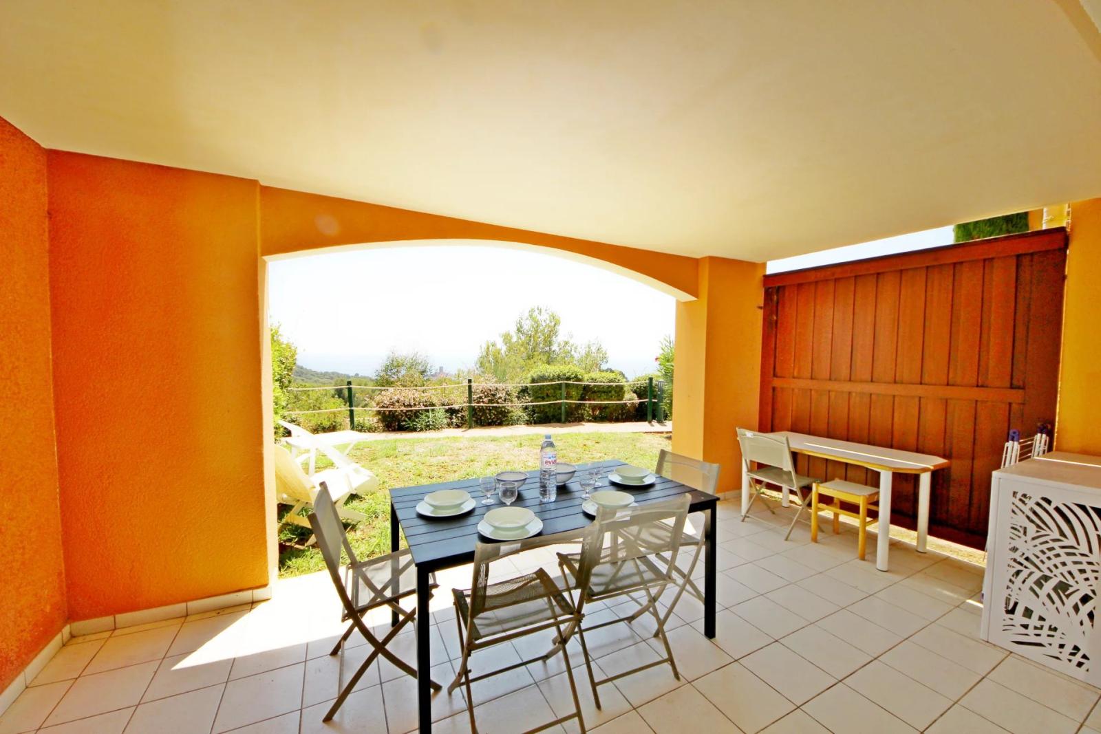 Agay Cap Esterel le Hameau, superbe deux pièces type large avec terrasse couverte et jardinet exposé au Sud avec vue panoramique sur la mer et l'ile d'or. Parking privé couvert et cave privée à proximité. Plage et commerces à pieds. A ne pas manquer!