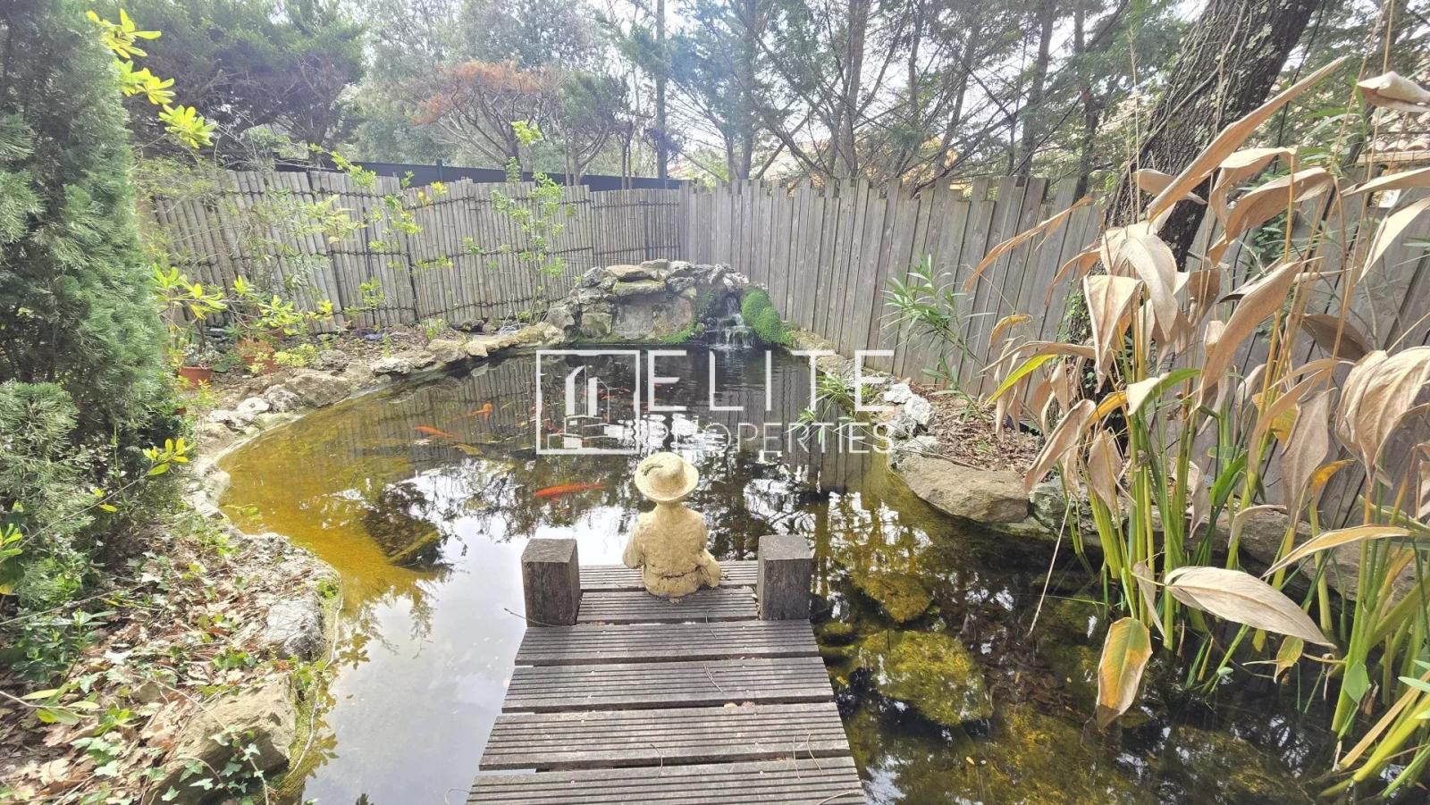 • Jardin paysagé avec fontaine et bassin à carpes koï traversé par un petit pont en pierre