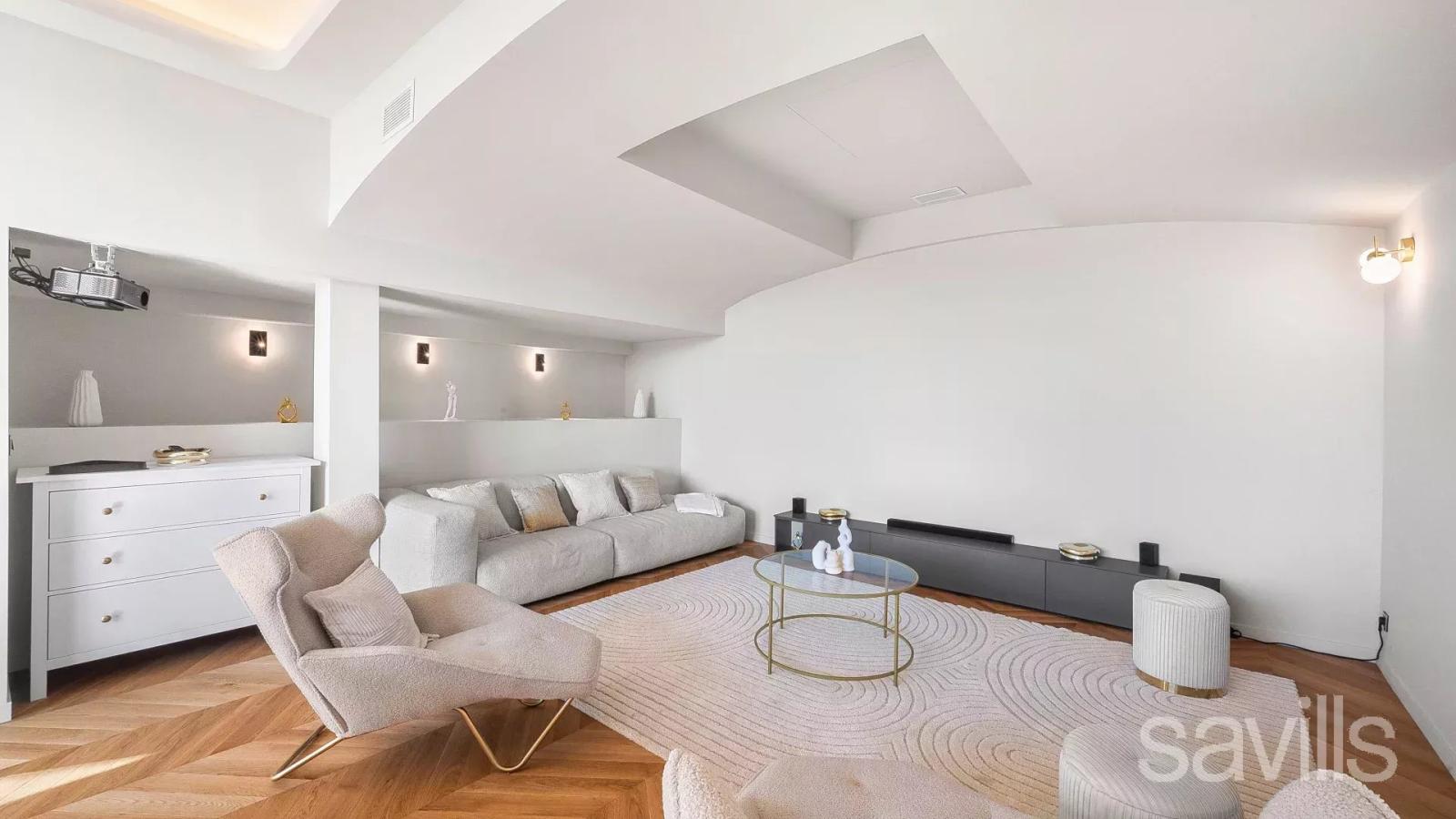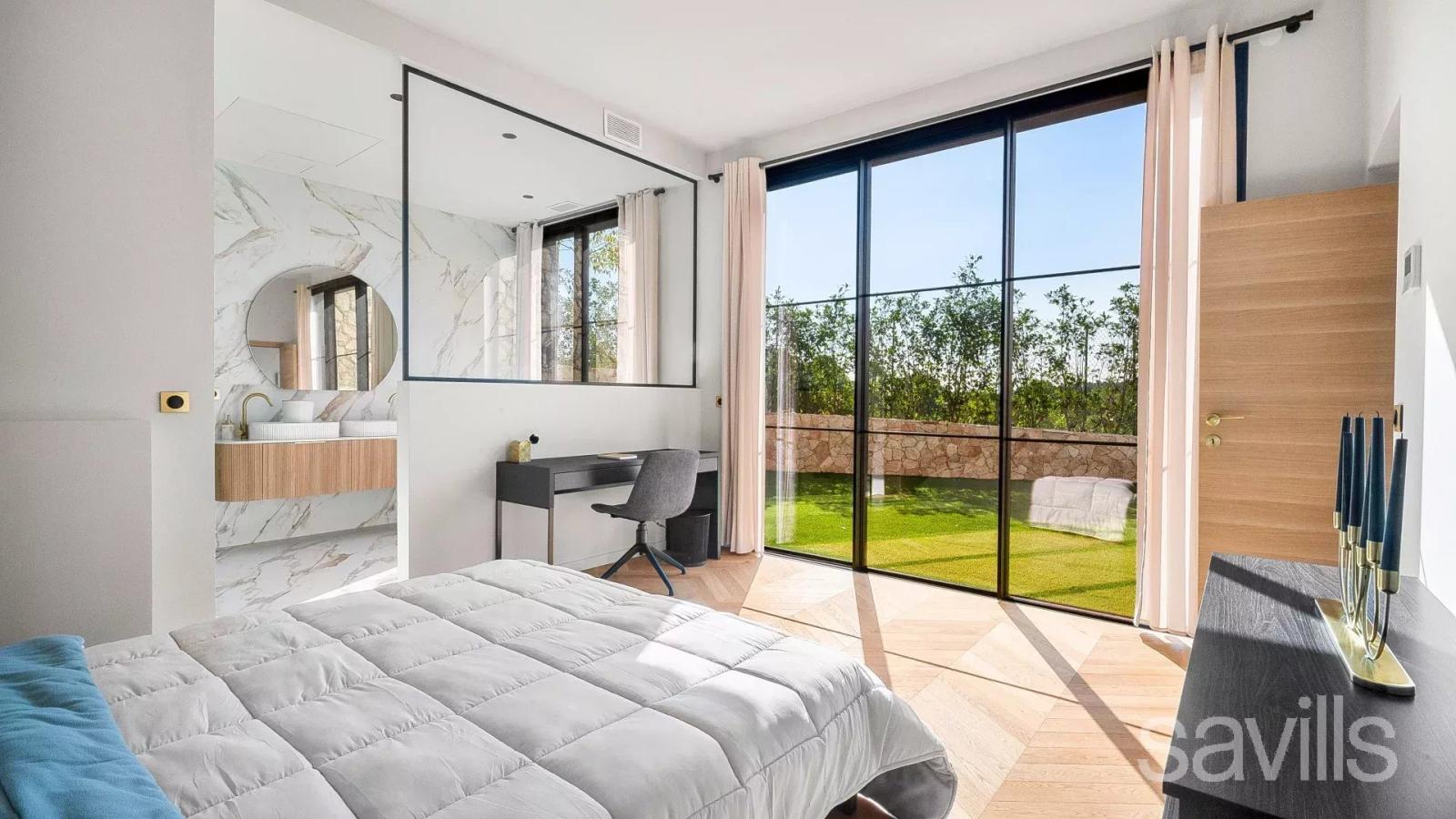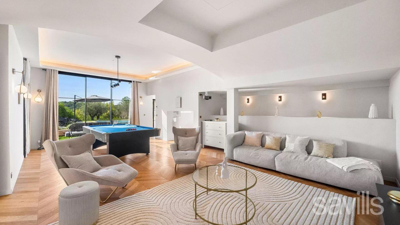 Au niveau jardin, vous trouverez une lumineuse salle de cinéma ou salle de jeux, une élégante cinquième chambre avec grande salle de bains attenante, ainsi qu’un hammam et un sauna avec accès direct à la piscine exposée plein sud.