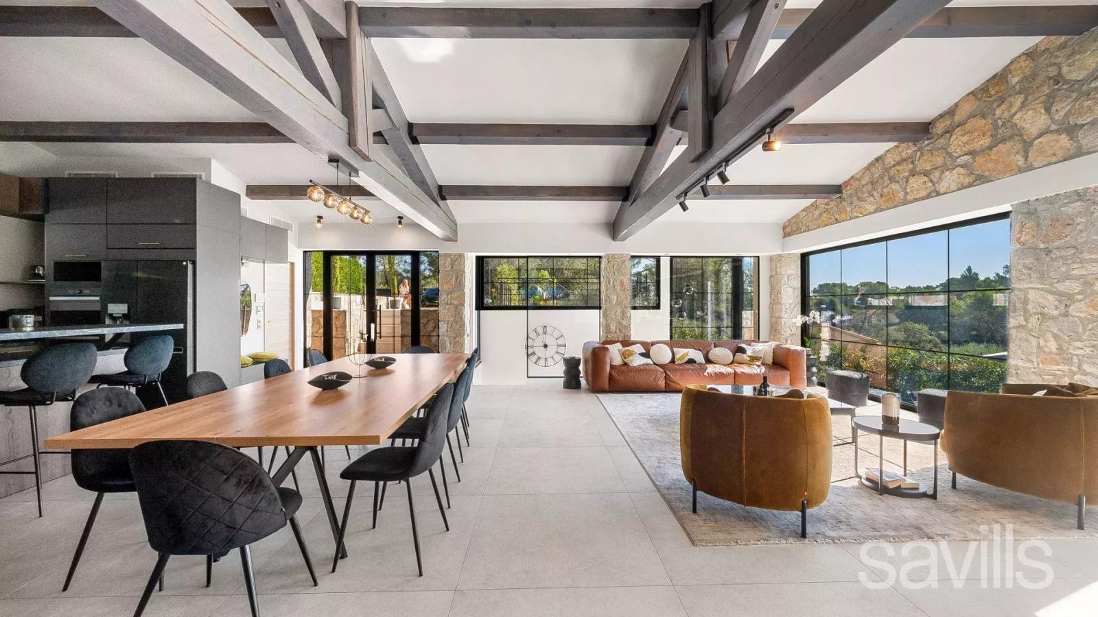 À Mougins, au cœur d’un domaine privé, fermé et sécurisé, cette élégante villa de 250 m² offre un cadre de vie paisible et raffiné, à quelques pas de l’étang de Fontmerle, des commerces, des écoles et des grands axes routiers. Baignée de lumière, sans vis-à-vis, elle bénéficie d’une exposition idéale et de superbes vues dégagées sur les collines environnantes. Dès l’entrée, un vaste hall avec vestiaire mène à un séjour lumineux doté d’une cheminée, de poutres apparentes et d’une belle hauteur sous plafond. La salle à manger s’ouvre sur une cuisine indépendante, moderne et fonctionnelle, avec buanderie attenante. Le rez-de-chaussée comprend deux chambres, dont une belle suite parentale de 27 m² avec salle de bains et toilettes, ainsi qu’une seconde chambre avec sa salle de bains privative. Un grand bureau, baigné de lumière et ouvert sur le jardin, constitue un espace idéal pour le télétravail. À l’étage, deux chambres supplémentaires profitent d’une vue panoramique sur le massif de l’Esterel et partagent une salle de douche avec WC. Le sous-sol accueille une chambre de service avec salle d’eau, trois caves, un atelier, ainsi qu’un vaste garage de près de 70 m². À l’extérieur, le terrain de 1 700 m² paysagé avec soin abrite une piscine au sel chauffée, un pool house avec cuisine d’été, de vastes terrasses et une végétation méditerranéenne généreuse. Située dans un lotissement de 14 lots sans procédure en cours, cette propriété allie calme absolu et proximité des commodités, avec des charges annuelles limitées à 300 €. Un bien rare à quelques minutes de Cannes, Nice et de l’aéroport international.