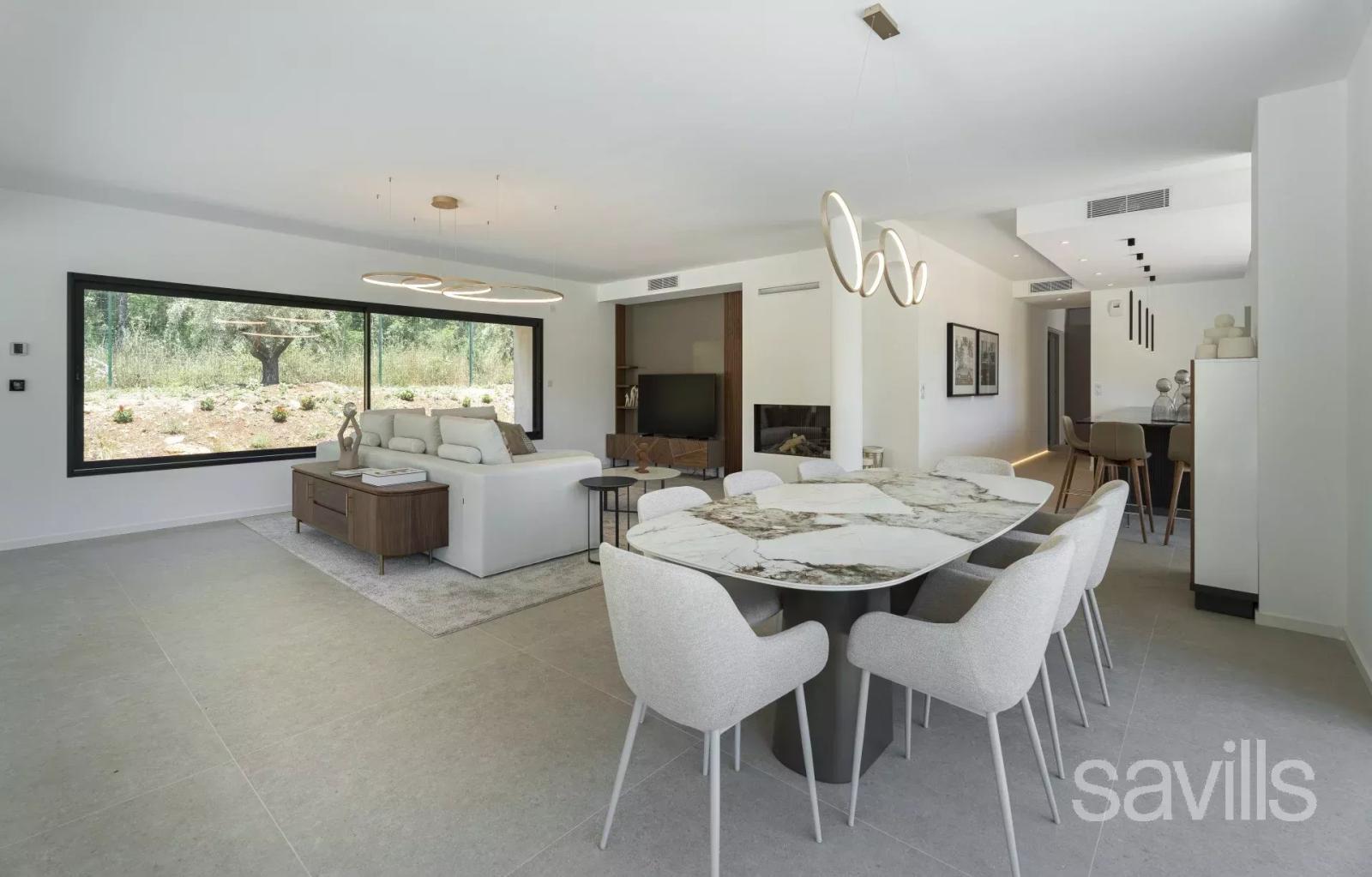À Mougins, au cœur d’un domaine privé, fermé et sécurisé, cette élégante villa de 250 m² offre un cadre de vie paisible et raffiné, à quelques pas de l’étang de Fontmerle, des commerces, des écoles et des grands axes routiers. Baignée de lumière, sans vis-à-vis, elle bénéficie d’une exposition idéale et de superbes vues dégagées sur les collines environnantes. Dès l’entrée, un vaste hall avec vestiaire mène à un séjour lumineux doté d’une cheminée, de poutres apparentes et d’une belle hauteur sous plafond. La salle à manger s’ouvre sur une cuisine indépendante, moderne et fonctionnelle, avec buanderie attenante. Le rez-de-chaussée comprend deux chambres, dont une belle suite parentale de 27 m² avec salle de bains et toilettes, ainsi qu’une seconde chambre avec sa salle de bains privative. Un grand bureau, baigné de lumière et ouvert sur le jardin, constitue un espace idéal pour le télétravail. À l’étage, deux chambres supplémentaires profitent d’une vue panoramique sur le massif de l’Esterel et partagent une salle de douche avec WC. Le sous-sol accueille une chambre de service avec salle d’eau, trois caves, un atelier, ainsi qu’un vaste garage de près de 70 m². À l’extérieur, le terrain de 1 700 m² paysagé avec soin abrite une piscine au sel chauffée, un pool house avec cuisine d’été, de vastes terrasses et une végétation méditerranéenne généreuse. Située dans un lotissement de 14 lots sans procédure en cours, cette propriété allie calme absolu et proximité des commodités, avec des charges annuelles limitées à 300 €. Un bien rare à quelques minutes de Cannes, Nice et de l’aéroport international.