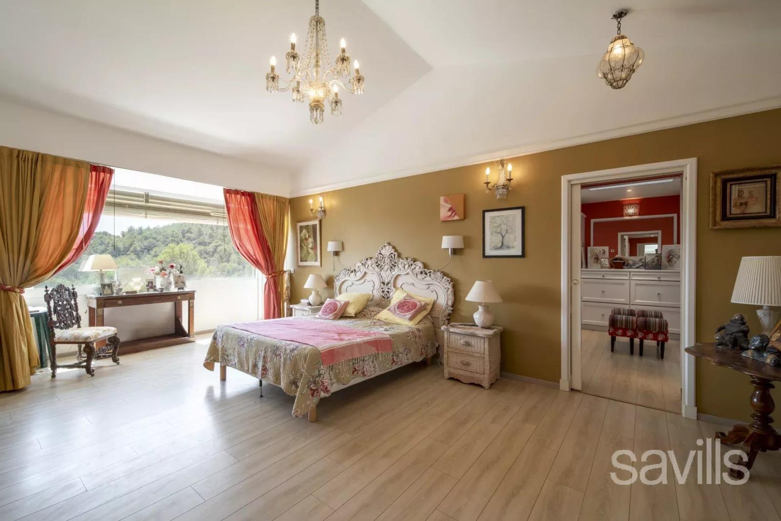 À Mougins, au cœur d’un domaine privé, fermé et sécurisé, cette élégante villa de 250 m² offre un cadre de vie paisible et raffiné, à quelques pas de l’étang de Fontmerle, des commerces, des écoles et des grands axes routiers. Baignée de lumière, sans vis-à-vis, elle bénéficie d’une exposition idéale et de superbes vues dégagées sur les collines environnantes. Dès l’entrée, un vaste hall avec vestiaire mène à un séjour lumineux doté d’une cheminée, de poutres apparentes et d’une belle hauteur sous plafond. La salle à manger s’ouvre sur une cuisine indépendante, moderne et fonctionnelle, avec buanderie attenante. Le rez-de-chaussée comprend deux chambres, dont une belle suite parentale de 27 m² avec salle de bains et toilettes, ainsi qu’une seconde chambre avec sa salle de bains privative. Un grand bureau, baigné de lumière et ouvert sur le jardin, constitue un espace idéal pour le télétravail. À l’étage, deux chambres supplémentaires profitent d’une vue panoramique sur le massif de l’Esterel et partagent une salle de douche avec WC. Le sous-sol accueille une chambre de service avec salle d’eau, trois caves, un atelier, ainsi qu’un vaste garage de près de 70 m². À l’extérieur, le terrain de 1 700 m² paysagé avec soin abrite une piscine au sel chauffée, un pool house avec cuisine d’été, de vastes terrasses et une végétation méditerranéenne généreuse. Située dans un lotissement de 14 lots sans procédure en cours, cette propriété allie calme absolu et proximité des commodités, avec des charges annuelles limitées à 300 €. Un bien rare à quelques minutes de Cannes, Nice et de l’aéroport international.