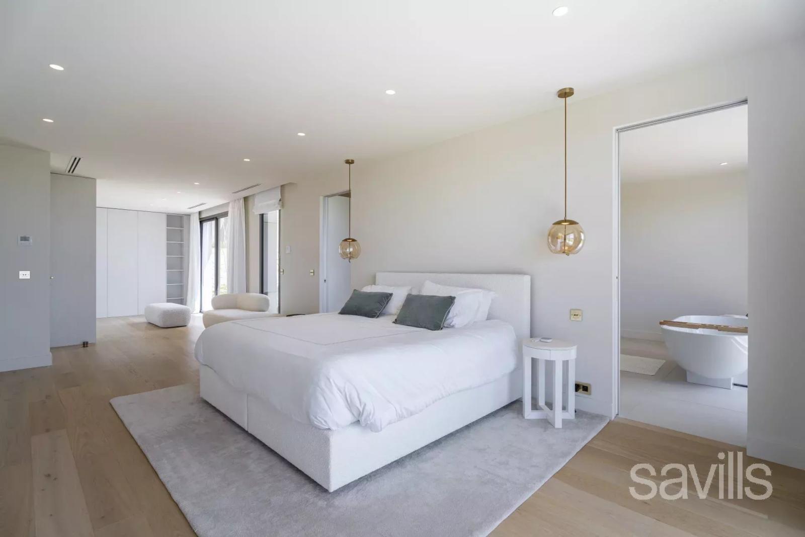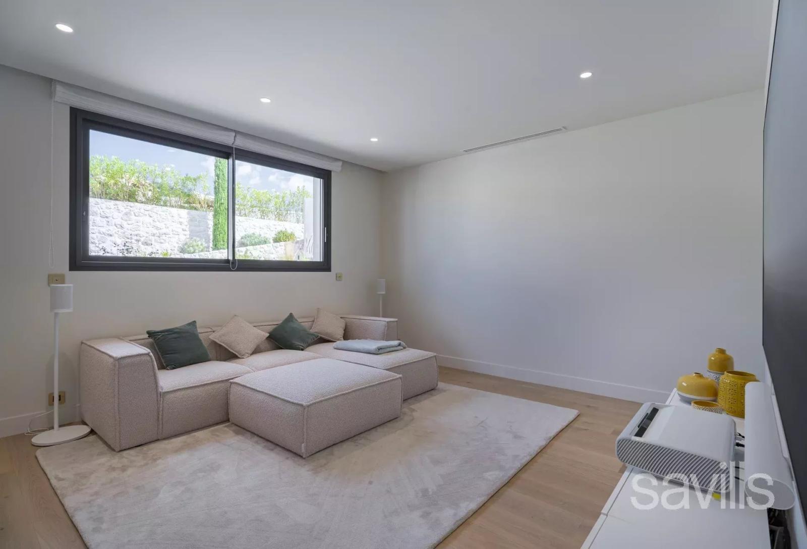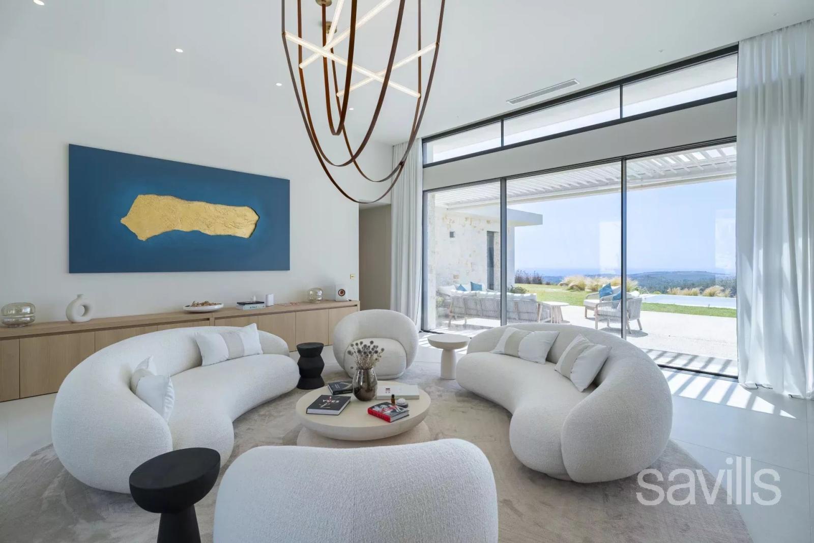 Conçue avec des volumes généreux et de larges ouvertures, elle offre de vastes espaces de réception baignés de lumière, s’ouvrant sur un panorama spectaculaire sur la mer et les collines environnantes.