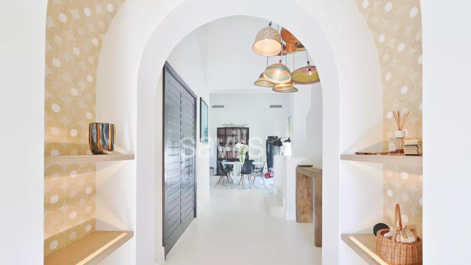La villa séduit par la générosité de ses volumes et la fluidité de ses espaces. Le vaste séjour lumineux, organisé autour d’une cheminée centrale, réunit salon et salles à manger et s’ouvre largement sur une terrasse offrant une vue dégagée sur la mer et les collines, ainsi que sur un patio paysager plus intime. La cuisine indépendante, entièrement équipée, se prolonge par une terrasse couverte avec espace repas et barbecue, idéale pour recevoir.