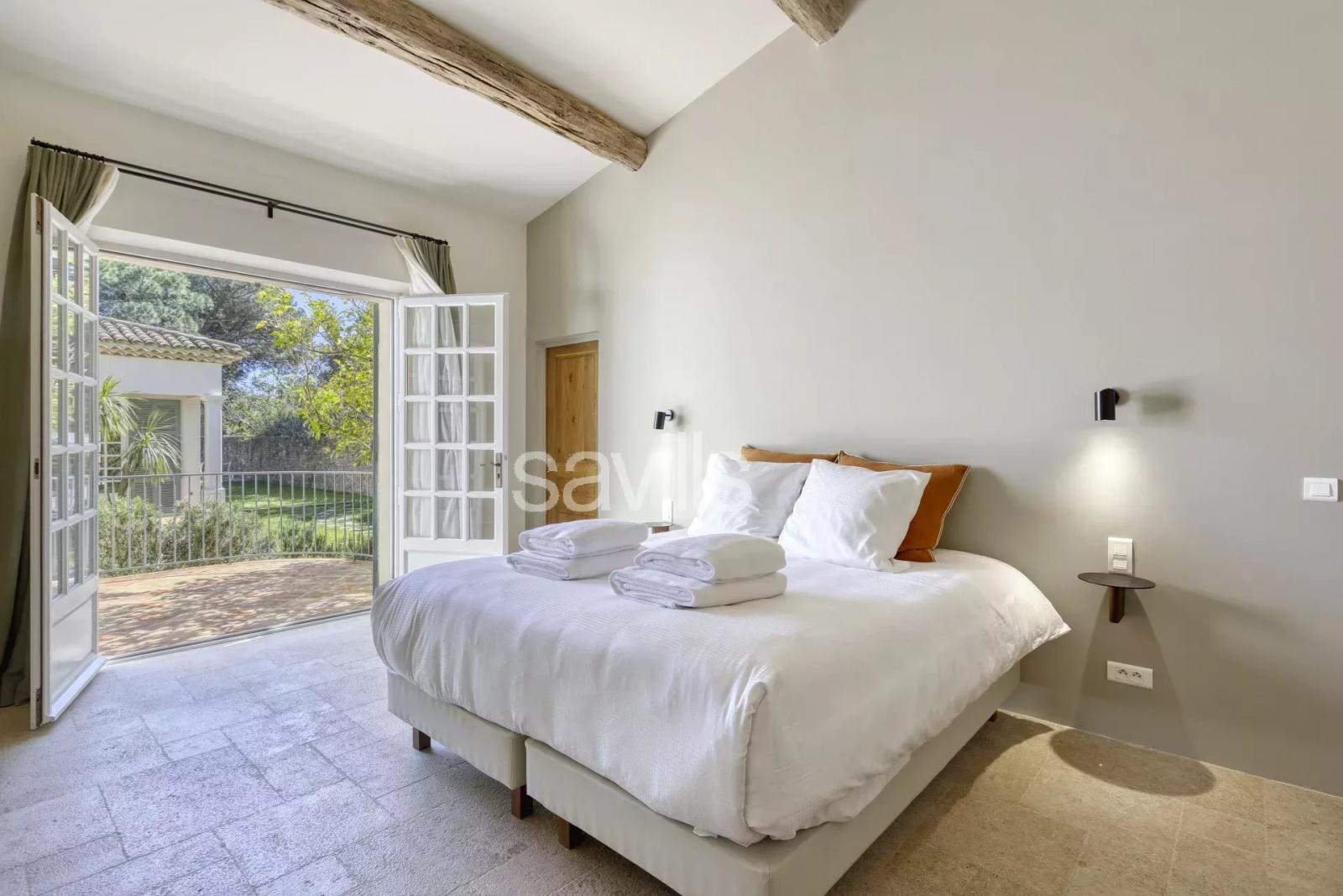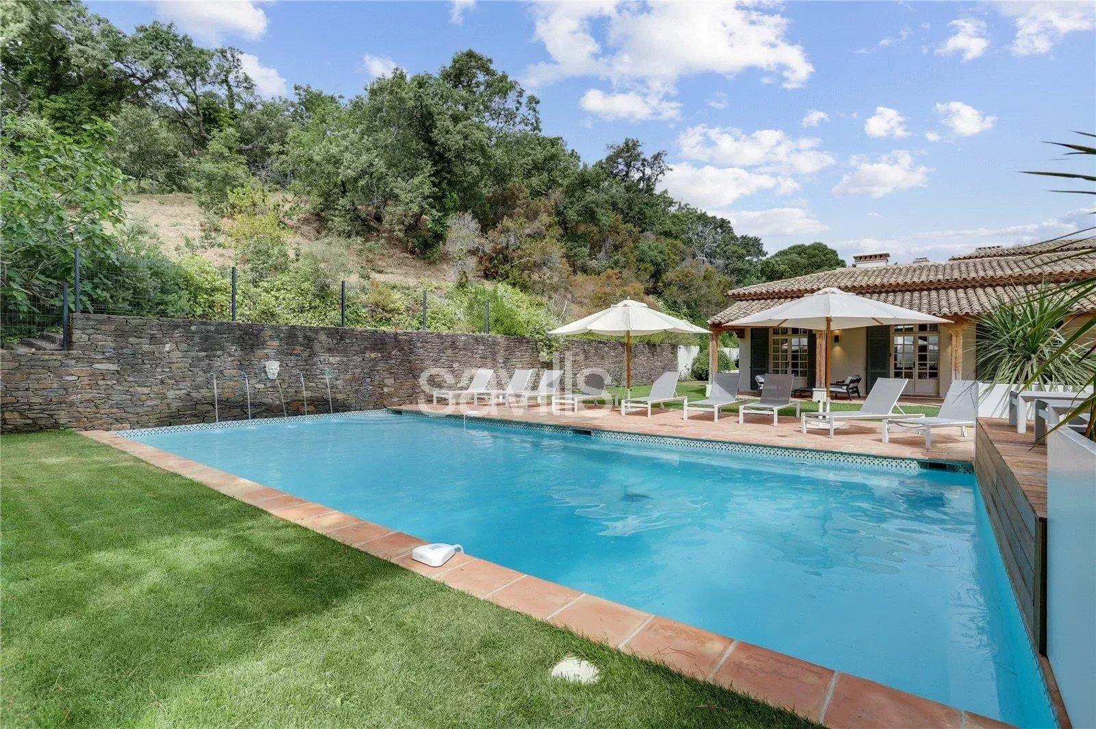 CO-EXCLUSIVITE Idéalement située entre la Plage de Pampelonne et Saint-Tropez, cette propriété s’inscrit au cœur d’un jardin paysager de près d'un hectare d’inspiration provençale, dans un environnement privilégié et préservé. La villa séduit par la générosité de ses volumes et la fluidité de ses espaces. Le vaste séjour lumineux, organisé autour d’une cheminée centrale, réunit salon et salles à manger et s’ouvre largement sur une terrasse offrant une vue dégagée sur la mer et les collines, ainsi que sur un patio paysager plus intime. La cuisine indépendante, entièrement équipée, se prolonge par une terrasse couverte avec espace repas et barbecue, idéale pour recevoir. La propriété propose sept chambres, dont plusieurs suites, réparties harmonieusement pour garantir confort et intimité. À l’étage, la suite principale dispose d’un dressing, d’une salle de bains complète avec baignoire et douche, et d’une terrasse privative bénéficiant d’une vue mer. Une chambre pour le personnel ainsi qu’une buanderie complètent l’ensemble. Le jardin en restanques dévoile différents espaces de détente, avec un terrain de pétanque et, en contrebas, une piscine chauffée de 6 x 13 mètres accompagnée de son pool house aménagé avec bar et salons ombragés. Climatisation réversible, fibre internet, système d’alarme et stationnement pour quatre véhicules avec borne de recharge électrique viennent parfaire cette propriété, conjuguant raffinement, prestations haut de gamme et douceur de vivre sur la presqu’île.
