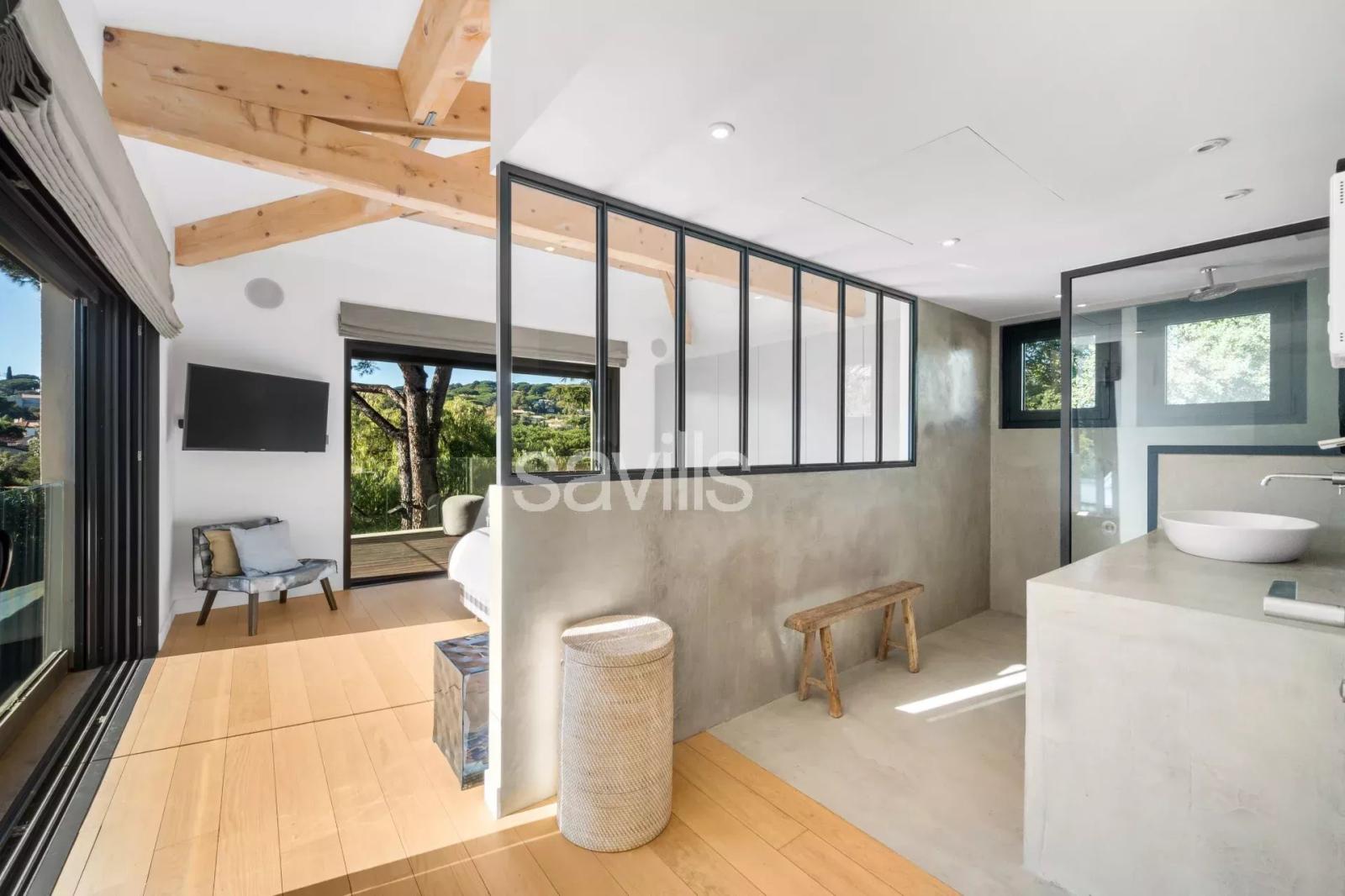 Au cœur d’un secteur paisible et prisé de Ramatuelle, à seulement cinq minutes à pied des plages emblématiques Pampelonne, cette villa de charme de plain pied, récemment rénovée, offre un cadre de vie rare avec une vue dégagée sur les vignes.