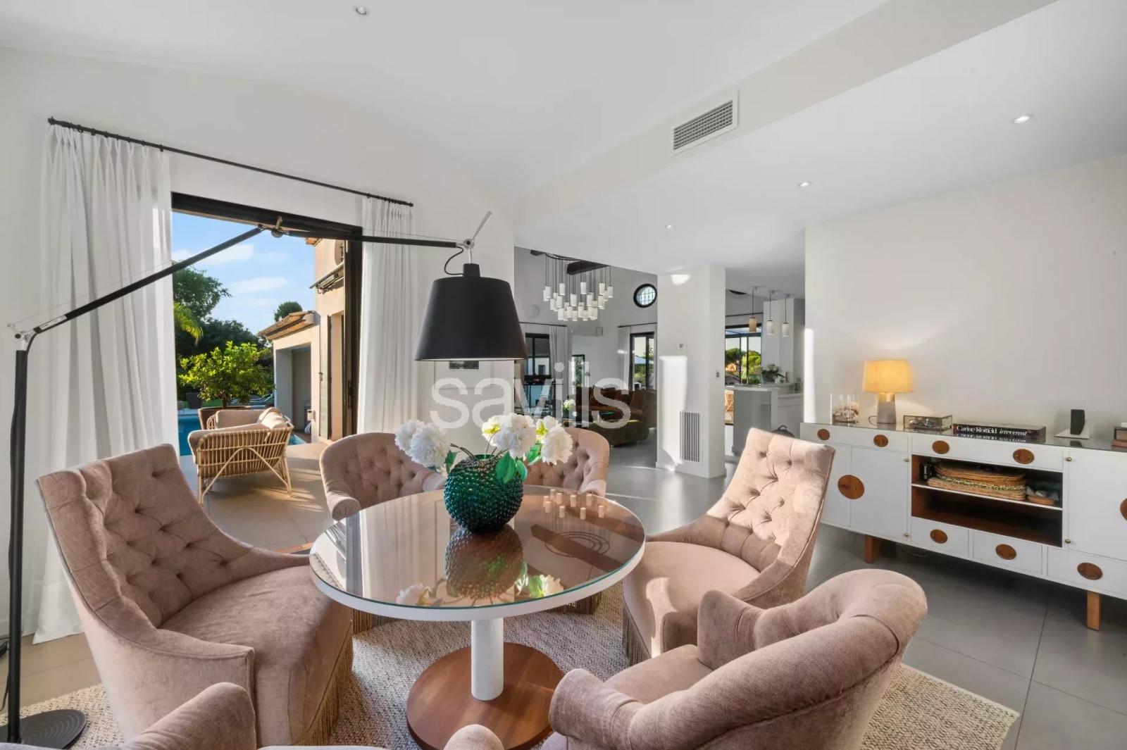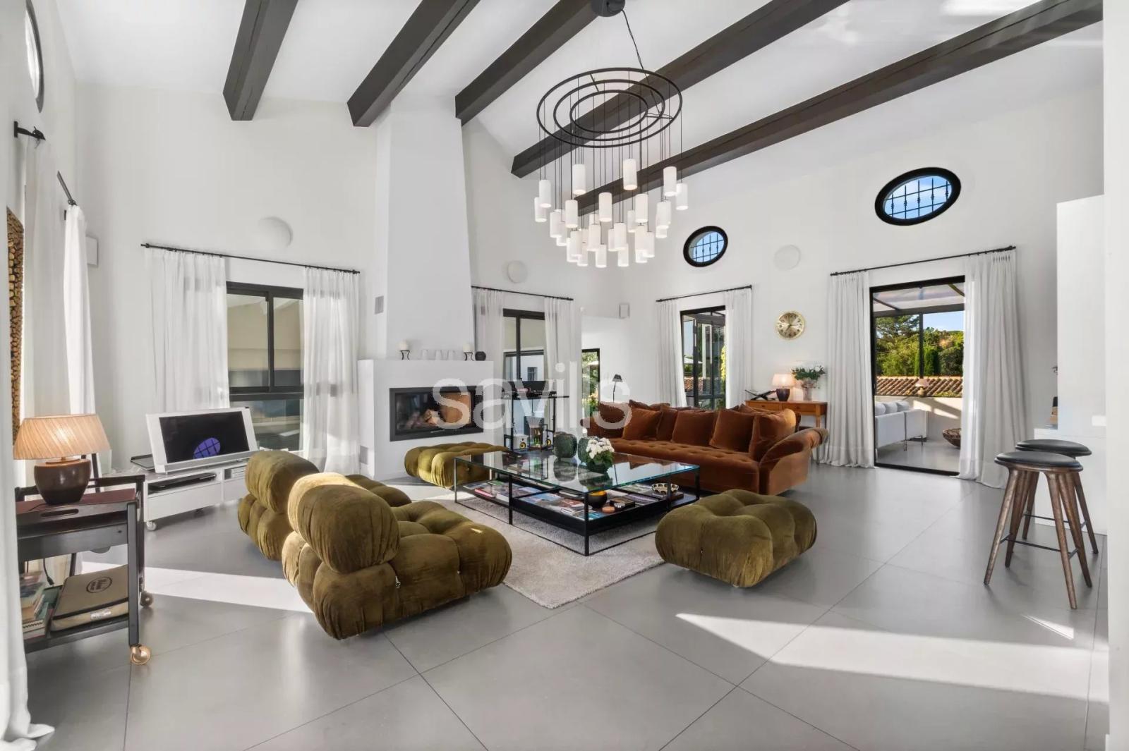 Au cœur de la villa, un vaste espace de vie ouvert avec cheminée et bibliothèque sur mesure se prolonge harmonieusement vers la salle à manger, la véranda, la cuisine équipée et plusieurs terrasses.