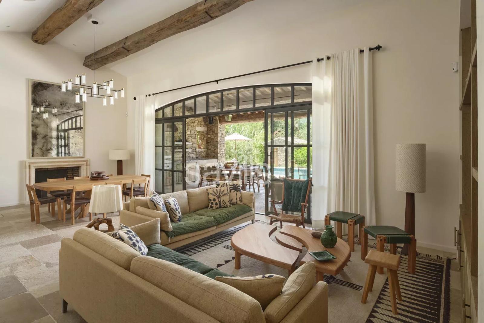 La villa s’articule autour de grandes pièces lumineuses aux volumes généreux, avec une hauteur sous plafond remarquable. Le cœur de vie – salon, salle à manger et cuisine ouverte avec îlot central – s’ouvre par de larges baies vitrées à galandage en ferronnerie ancienne sur une vaste terrasse couverte en pierre, invitant à la convivialité.