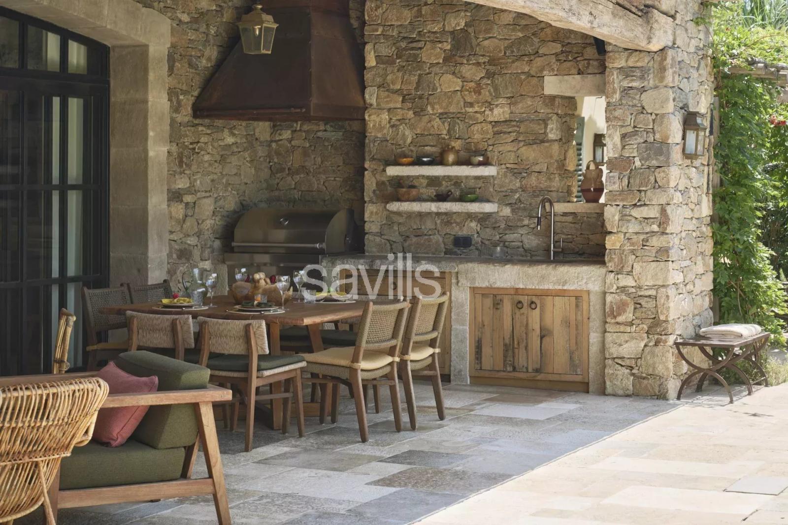 Une cuisine d'été parfaitement équipée (barbecue Wolf, évier, rangements) prolonge l’espace vers l’extérieur, face à la piscine chauffée et traitée au sel.