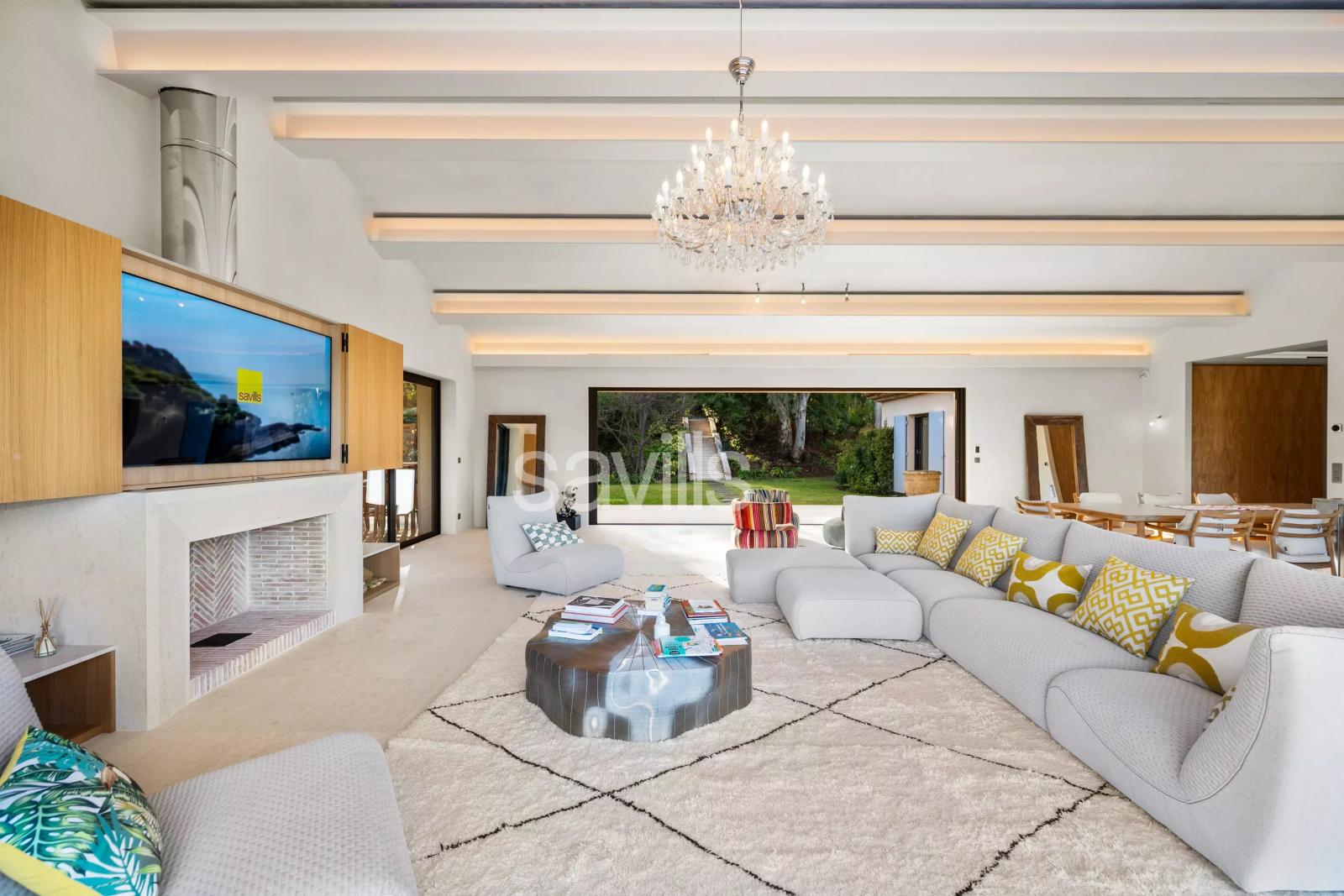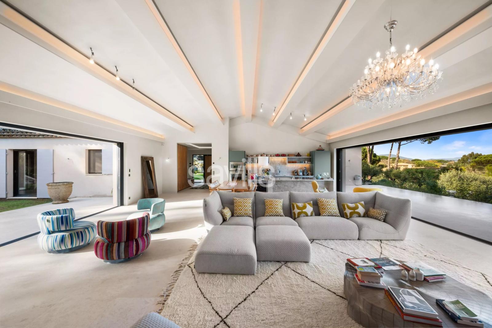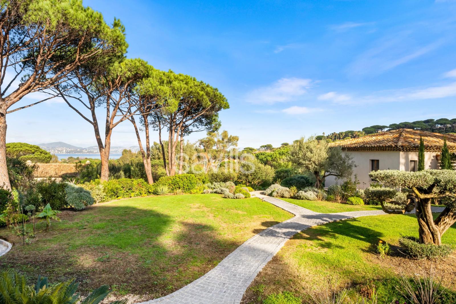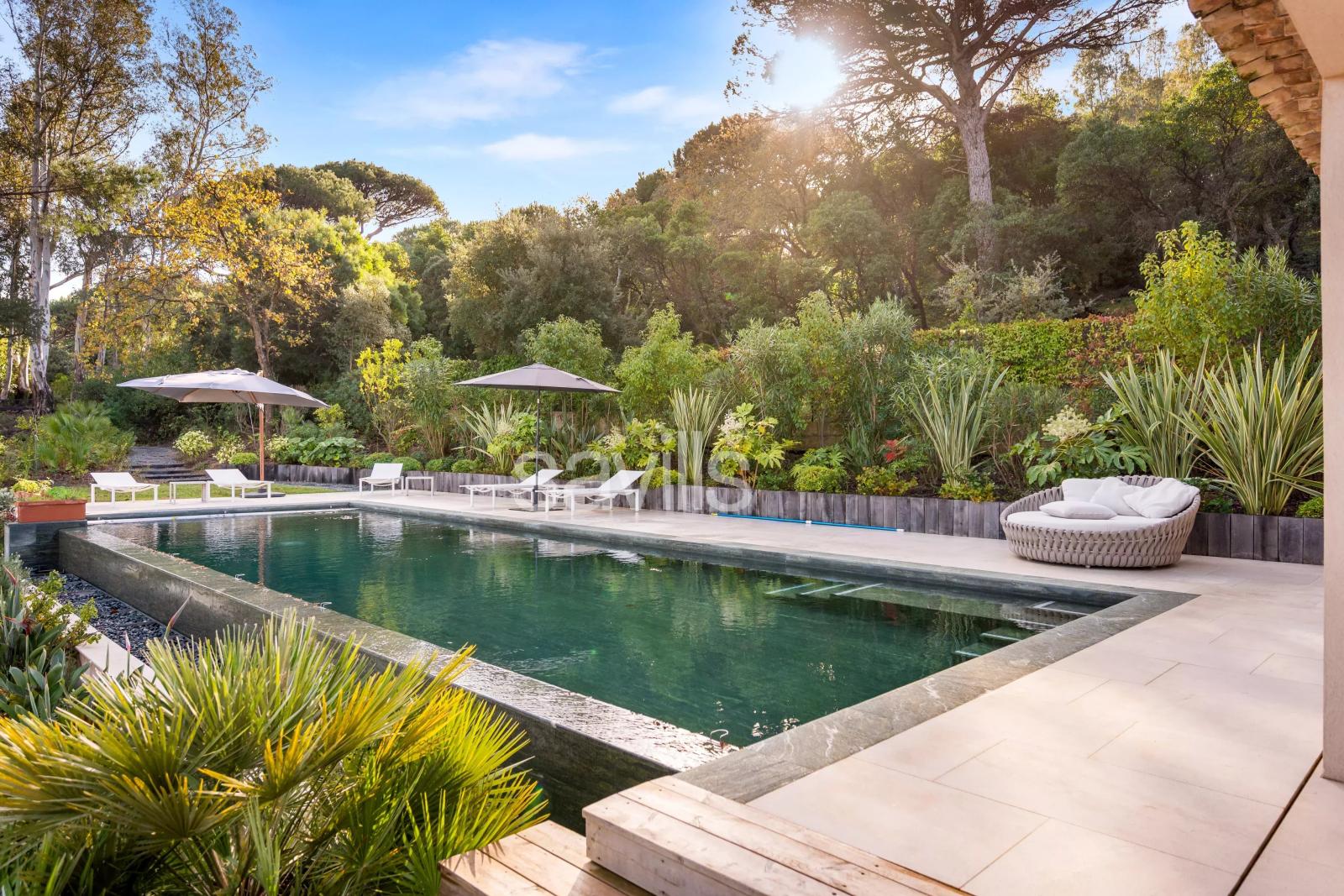 CO-EXCLUSIVITE Idéalement située entre la Plage de Pampelonne et Saint-Tropez, cette propriété s’inscrit au cœur d’un jardin paysager de près d'un hectare d’inspiration provençale, dans un environnement privilégié et préservé. La villa séduit par la générosité de ses volumes et la fluidité de ses espaces. Le vaste séjour lumineux, organisé autour d’une cheminée centrale, réunit salon et salles à manger et s’ouvre largement sur une terrasse offrant une vue dégagée sur la mer et les collines, ainsi que sur un patio paysager plus intime. La cuisine indépendante, entièrement équipée, se prolonge par une terrasse couverte avec espace repas et barbecue, idéale pour recevoir. La propriété propose sept chambres, dont plusieurs suites, réparties harmonieusement pour garantir confort et intimité. À l’étage, la suite principale dispose d’un dressing, d’une salle de bains complète avec baignoire et douche, et d’une terrasse privative bénéficiant d’une vue mer. Une chambre pour le personnel ainsi qu’une buanderie complètent l’ensemble. Le jardin en restanques dévoile différents espaces de détente, avec un terrain de pétanque et, en contrebas, une piscine chauffée de 6 x 13 mètres accompagnée de son pool house aménagé avec bar et salons ombragés. Climatisation réversible, fibre internet, système d’alarme et stationnement pour quatre véhicules avec borne de recharge électrique viennent parfaire cette propriété, conjuguant raffinement, prestations haut de gamme et douceur de vivre sur la presqu’île.