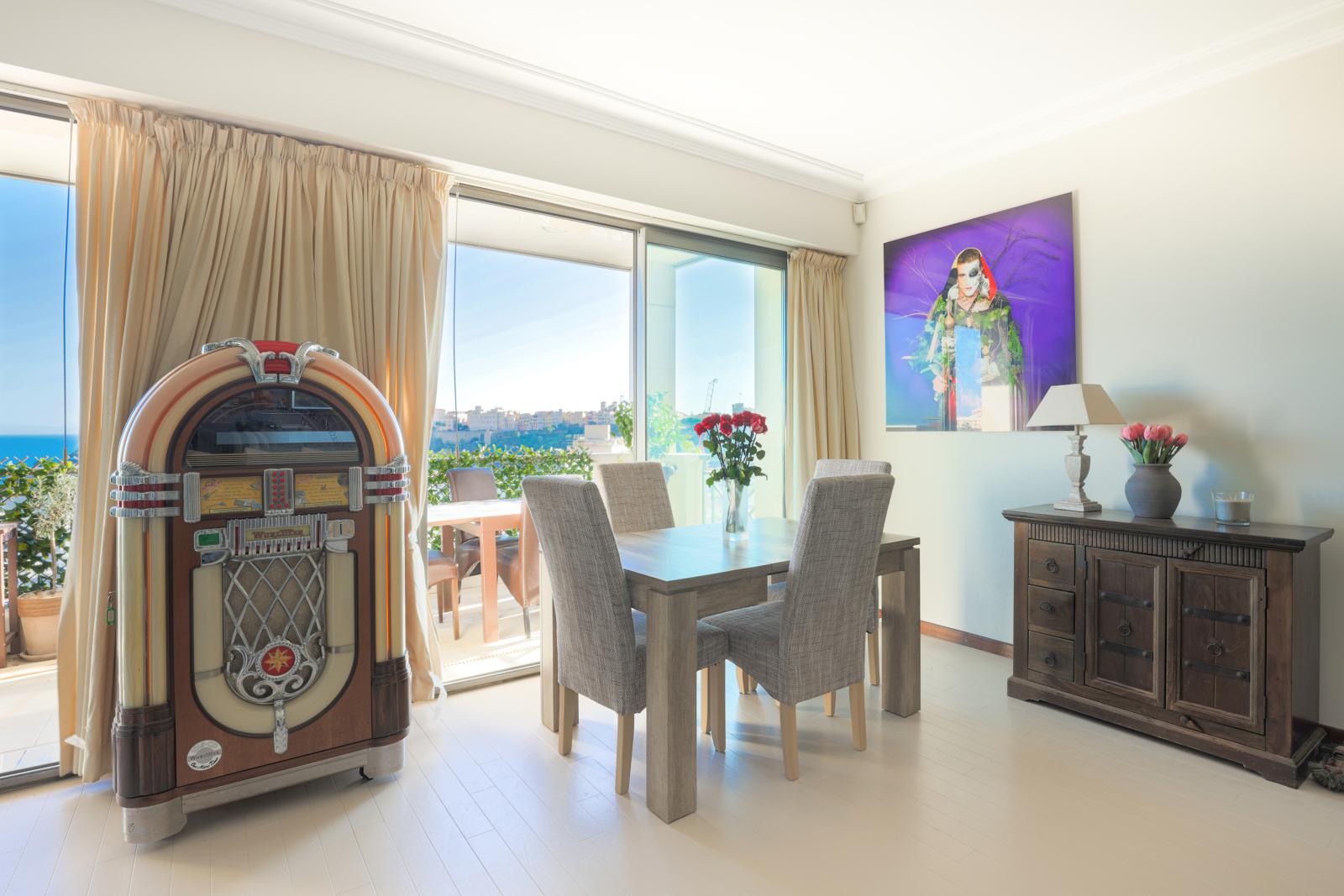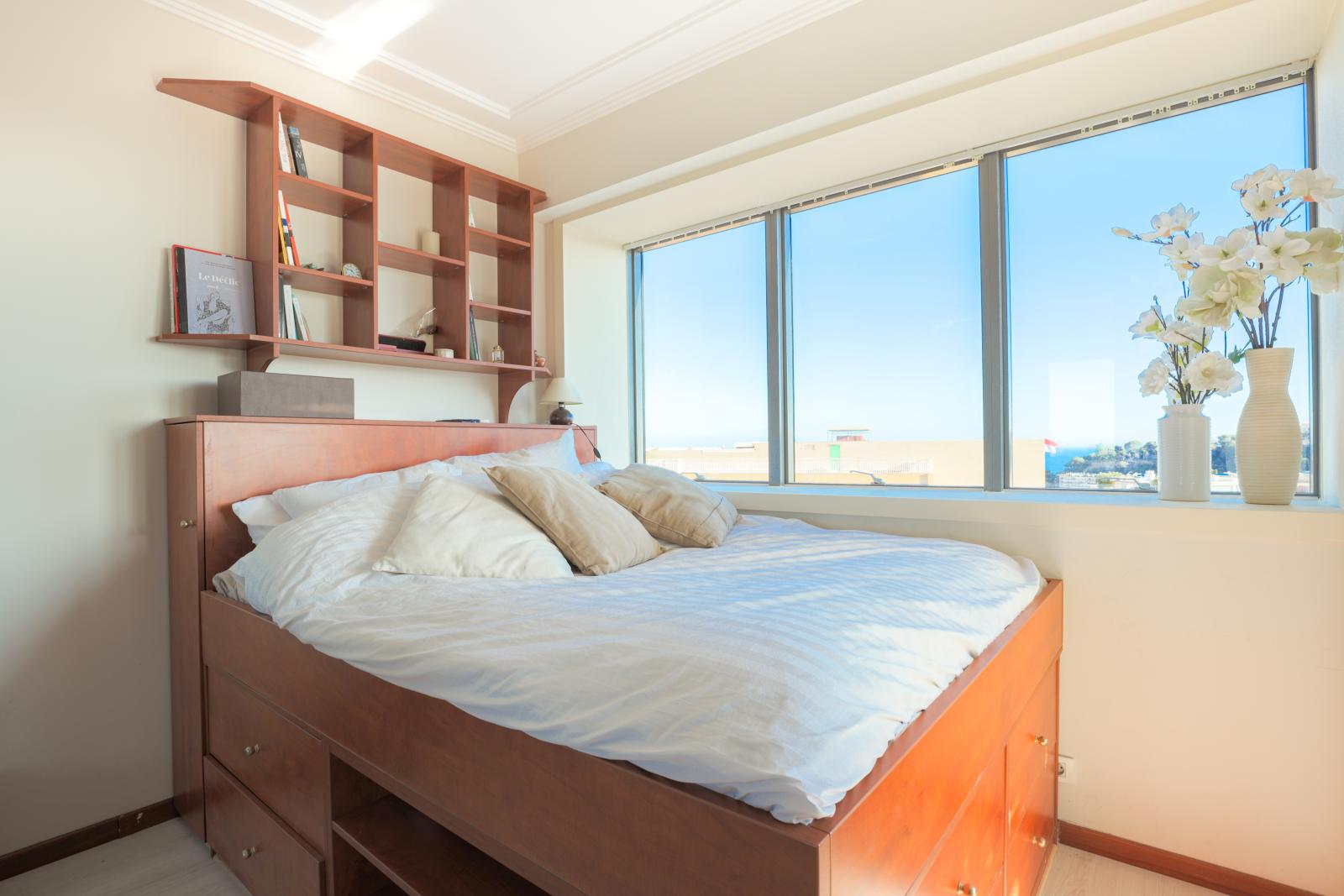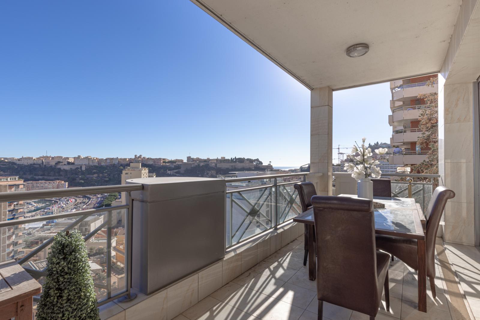 L’appartement domine le port de Monaco et offre une jolie vue sur la mer et le Palais Princier.