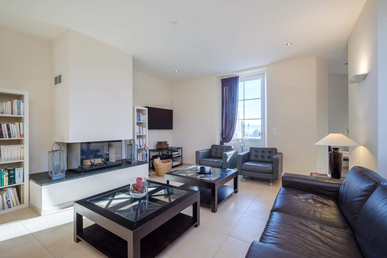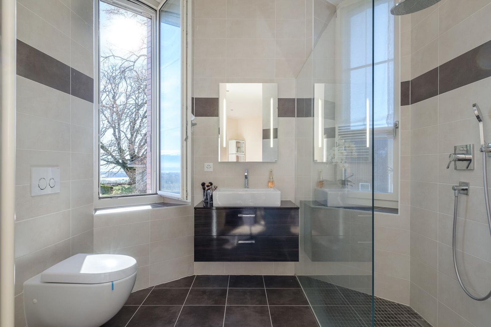 Cette villa de style contemporain remplit les critères Minergie et offre deux appartements de standing au bord du lac Léman, dans la charmante commune de Perroy.