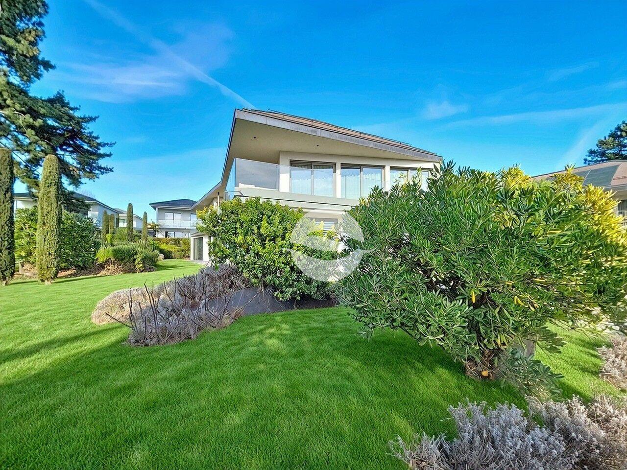 Cette villa de style contemporain remplit les critères Minergie et offre deux appartements de standing au bord du lac Léman, dans la charmante commune de Perroy.