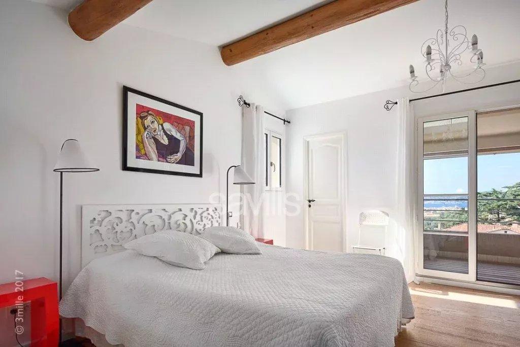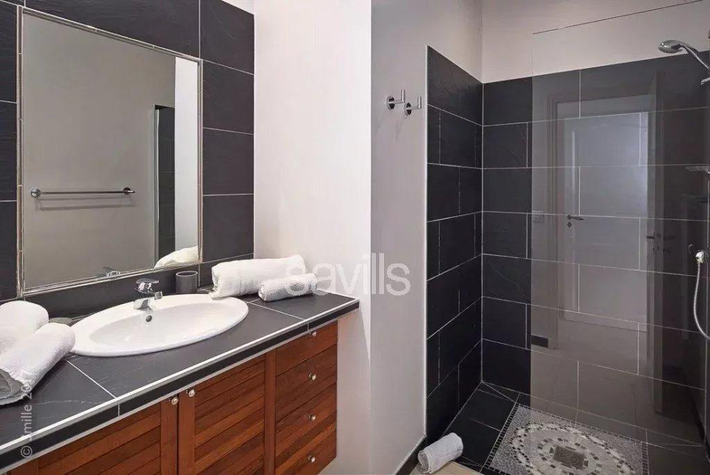 À l’étage, la suite principale dispose d’une salle de bains avec baignoire et douche, d’un dressing avec coffre-fort et d’une terrasse privée avec vue mer.
