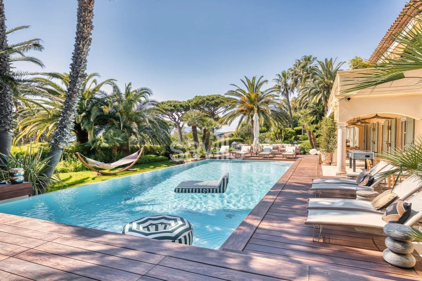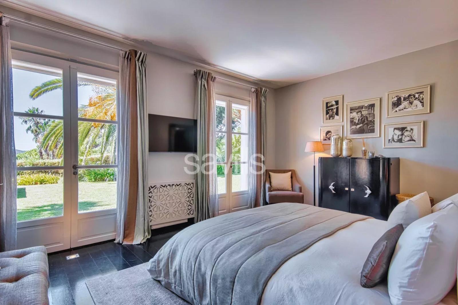 La villa dispose d'une vue mer sur la baie des Canoubiers et propose six chambres en suite, une cuisine d'été, espace Fitness équipé d'appareils TECHNOGYM, table de Baby Foot, Ping Pong, SAMSUNG Smart TV, SONOS Sound System, climatisation dans toutes les pièces, piscine à débordement avec mouvement de nage à jets, jacuzzi, vue imprenable depuis la terrasse de la piscine, jardin tropical, potager, arbres fruitiers, plantes aromatiques, abri de voiture couvert de quatre places.