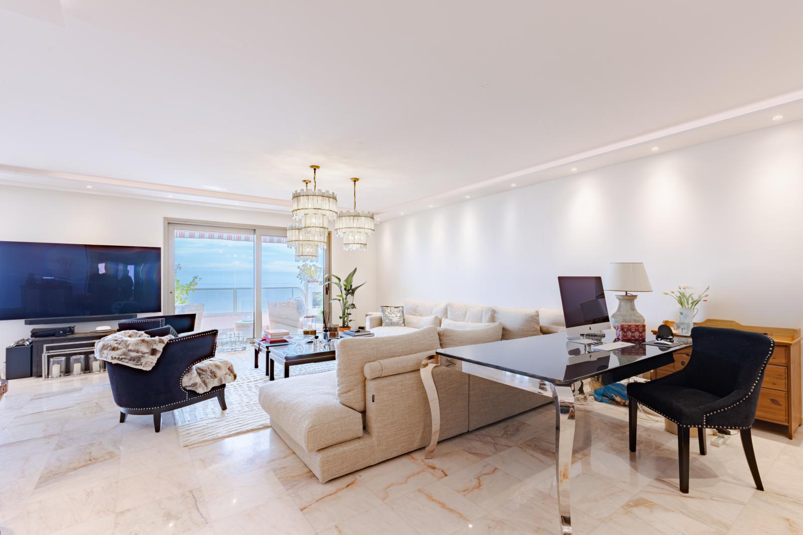 Superbe deux pièces entièrement rénové avec des matériaux haut de gamme, offrant une magnifique terrasse avec vue imprenable sur le Port Hercule, la Méditerranée et le Rocher de Monaco.