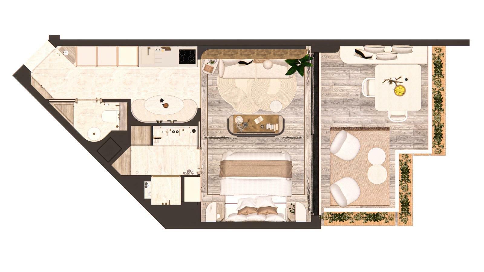 L’appartement comprend une entrée, un séjour spacieux, une cuisine entièrement équipée, une chambre confortable avec accès terrasse, des toilettes invités ainsi qu’une salle de bains.