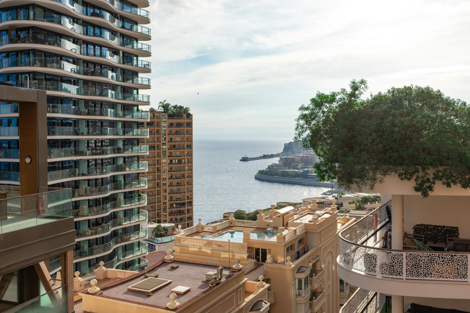 Superbe deux pièces entièrement rénové avec des matériaux haut de gamme, offrant une magnifique terrasse avec vue imprenable sur le Port Hercule, la Méditerranée et le Rocher de Monaco.
