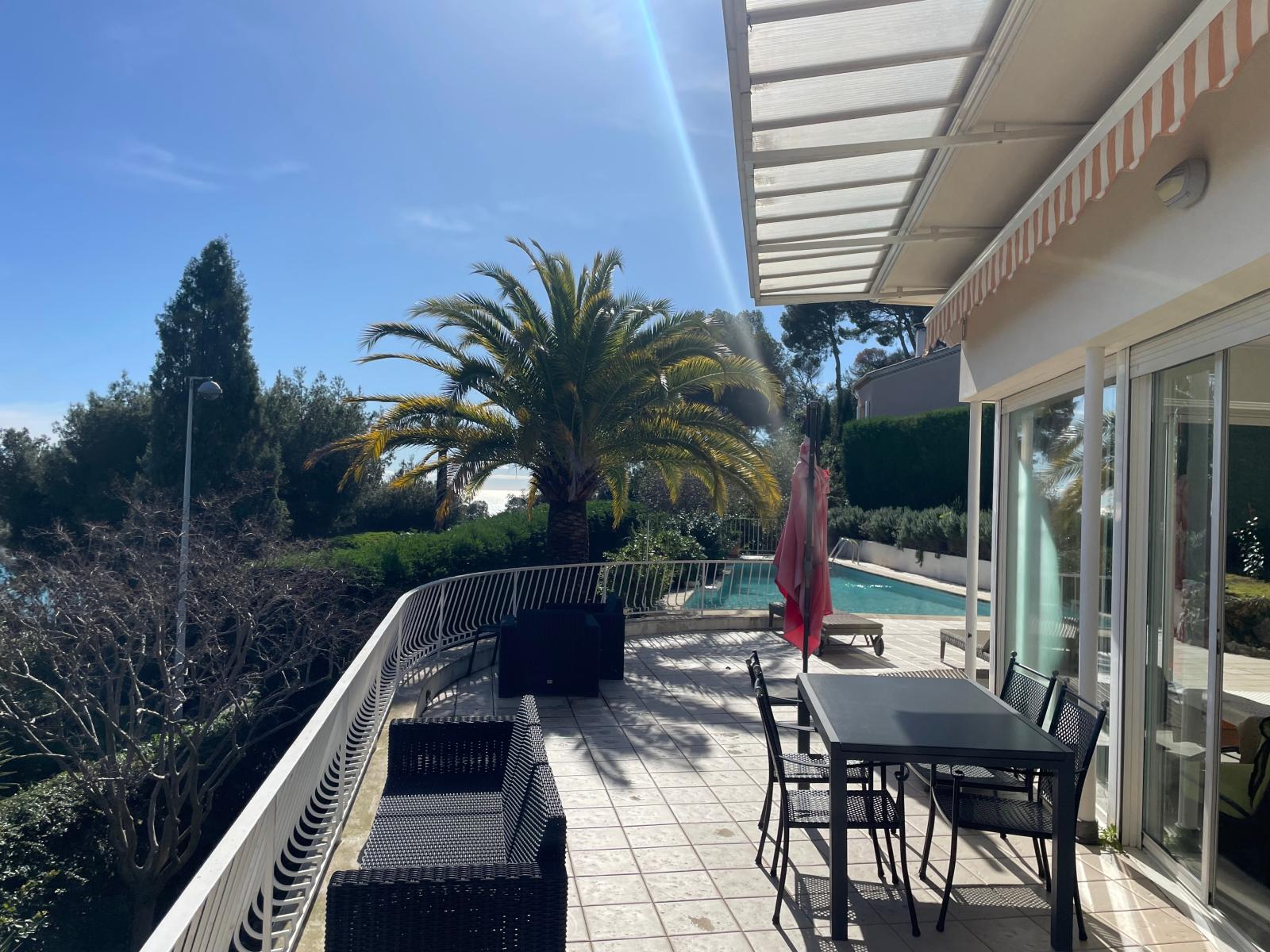 A vendre – une villa magnifiquement rénovée située dans un domaine privé et sécurisé, perchée sur les hauteurs de Théoule-sur-Mer. La propriété bénéficie d’une vue panoramique à couper le souffle sur la mer, les collines de l’Estérel et le port de Théoule. Répartie sur deux niveaux, la villa offre environ 120 m². de surface habitable. Le rez-de-chaussée comprend un grand salon double avec cheminée, une cuisine entièrement équipée et une chambre avec accès direct à la terrasse et à la piscine, avec une salle de douche attenante, ainsi qu’une deuxième chambre. A l’étage, la suite parentale comprend sa propre salle de bain et un grand balcon avec vue sur la mer. Au rez-de-chaussée inférieur, la propriété offre un garage fermé pour une voiture, une cave et un local technique. Le terrain magnifiquement entretenu de 1 500 m² comprennent plusieurs salons extérieurs accueillants, un charmant chalet et des places de stationnement supplémentaires. - Idéalement située, la villa se trouve à seulement 30 minutes de Cannes et de la Croisette, et à 45 minutes de l’aéroport international Nice Côte d’Azur.