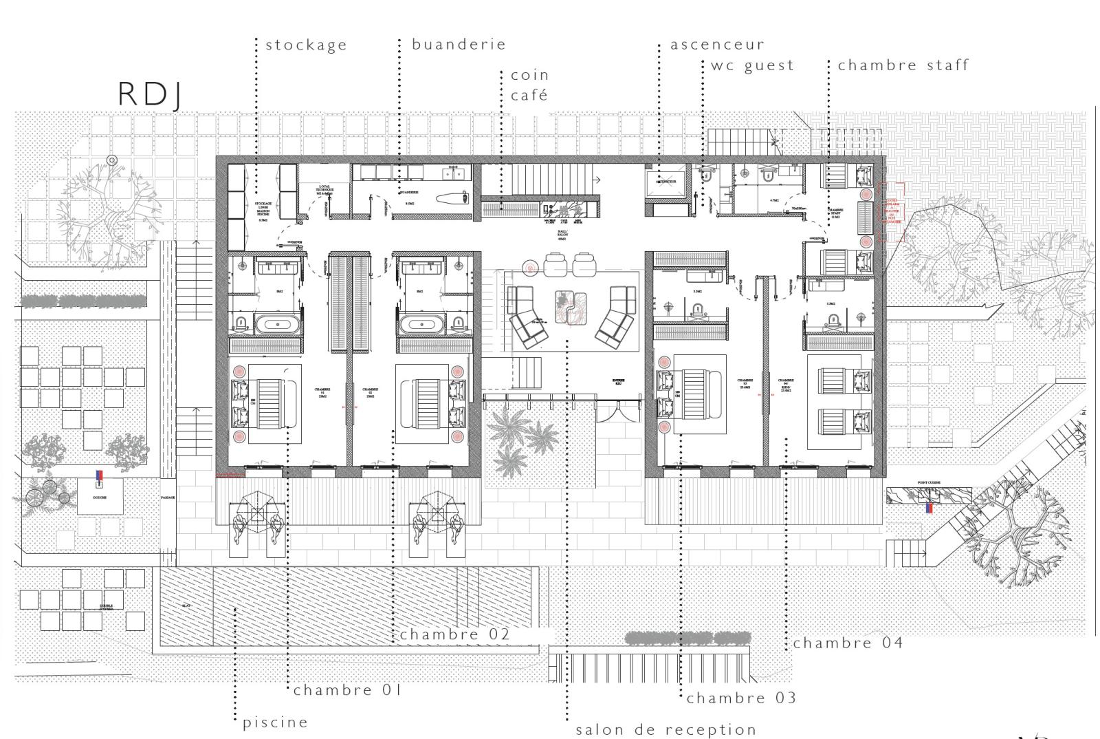 • Chambres : 5 chambres en suite + salle du personnel indépendante
