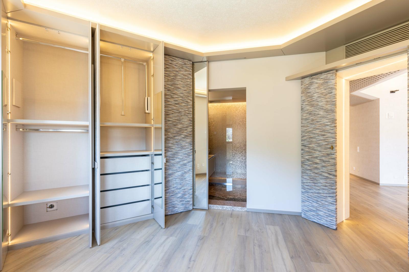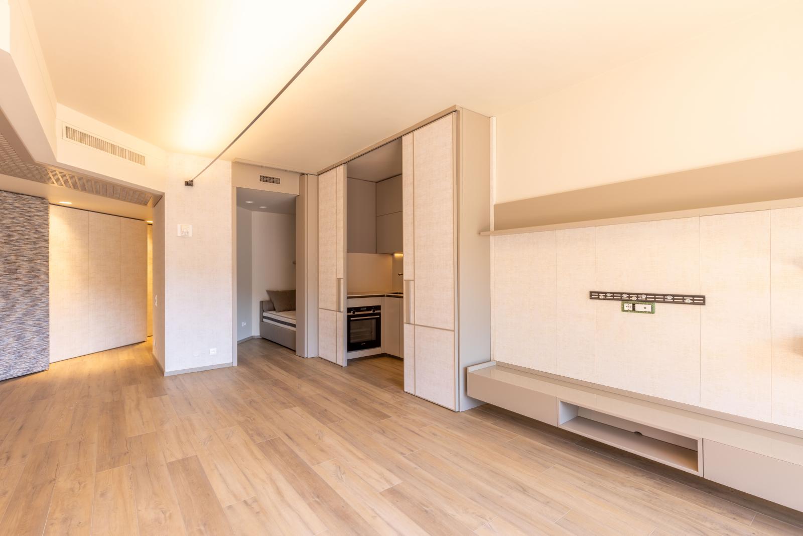Ce bien d'exception se compose d'un séjour lumineux ouvert sur la terrasse, d'une cuisine équipée avec des finitions de luxe, et d'une spacieuse chambre avec dressing sur mesure. La rénovation complète a été réalisée avec une attention particulière, créant un espace de vie moderne et raffiné.
