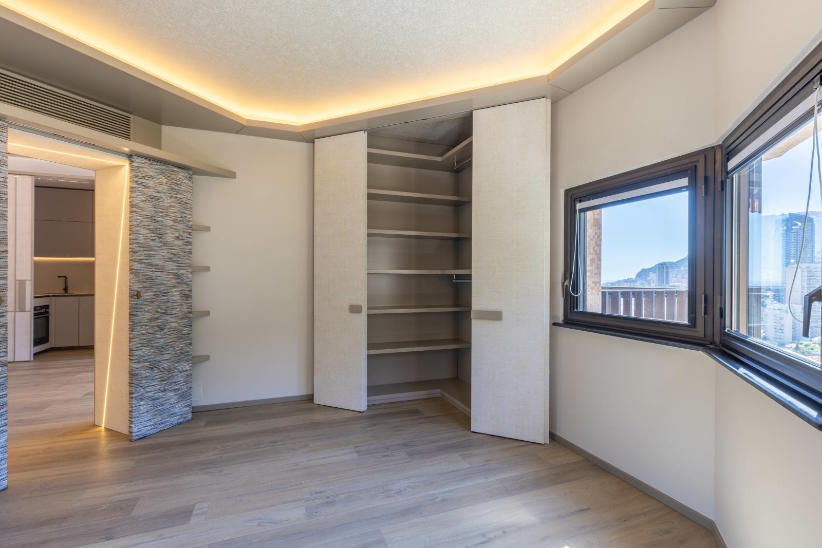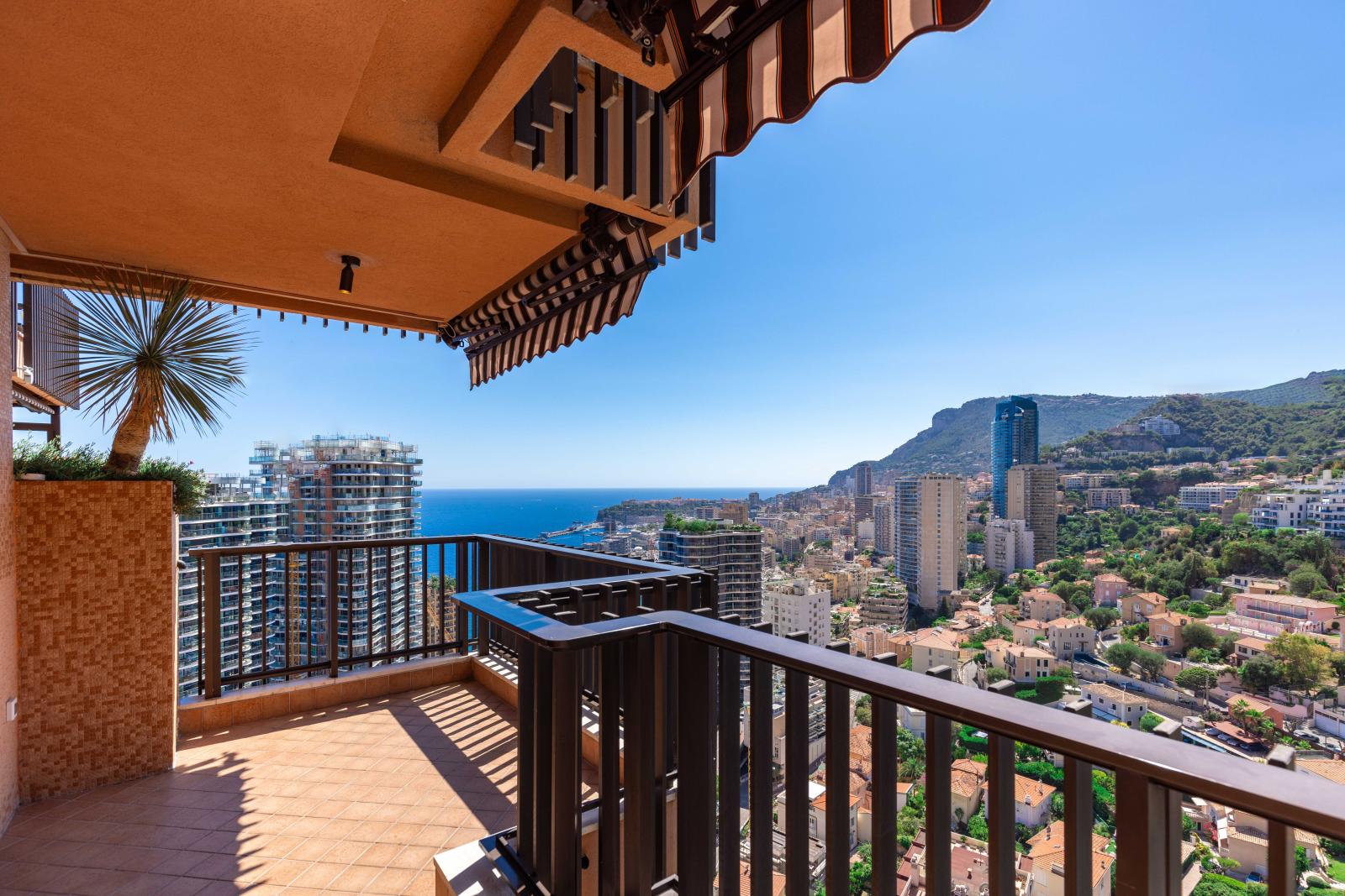 Superbe deux pièces entièrement rénové avec des matériaux haut de gamme, offrant une magnifique terrasse avec vue imprenable sur le Port Hercule, la Méditerranée et le Rocher de Monaco.