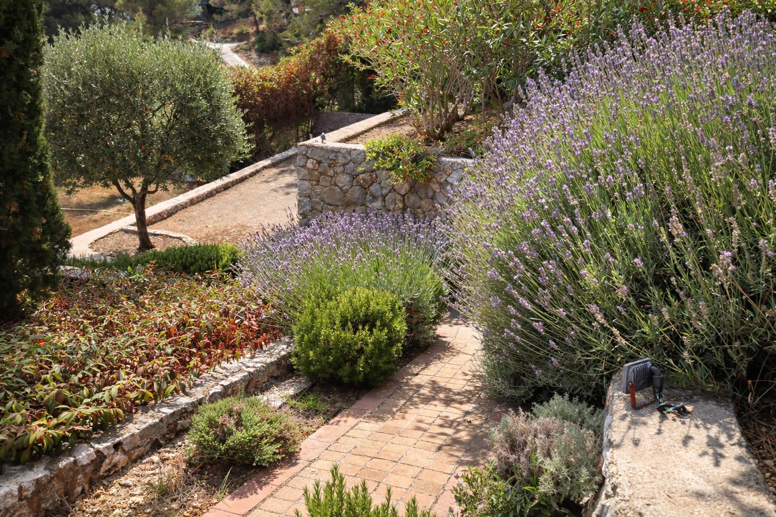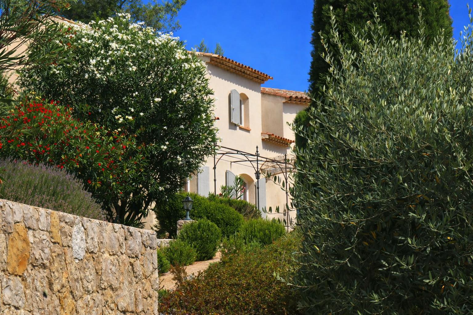 - En contrebas, un terrain de pétanque complète cet environnement méditerranéen, ponctué de lavandes et d'oliviers.