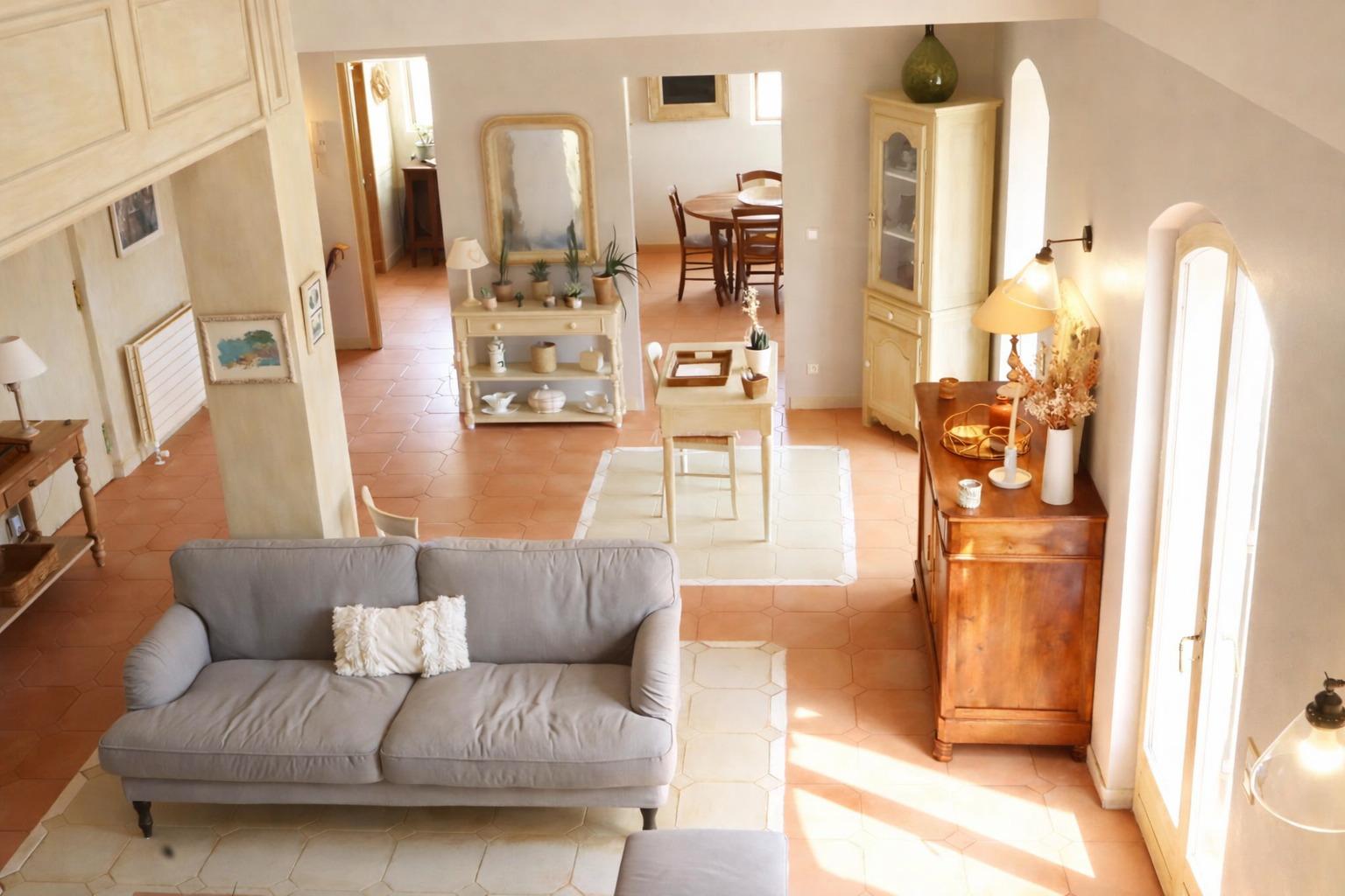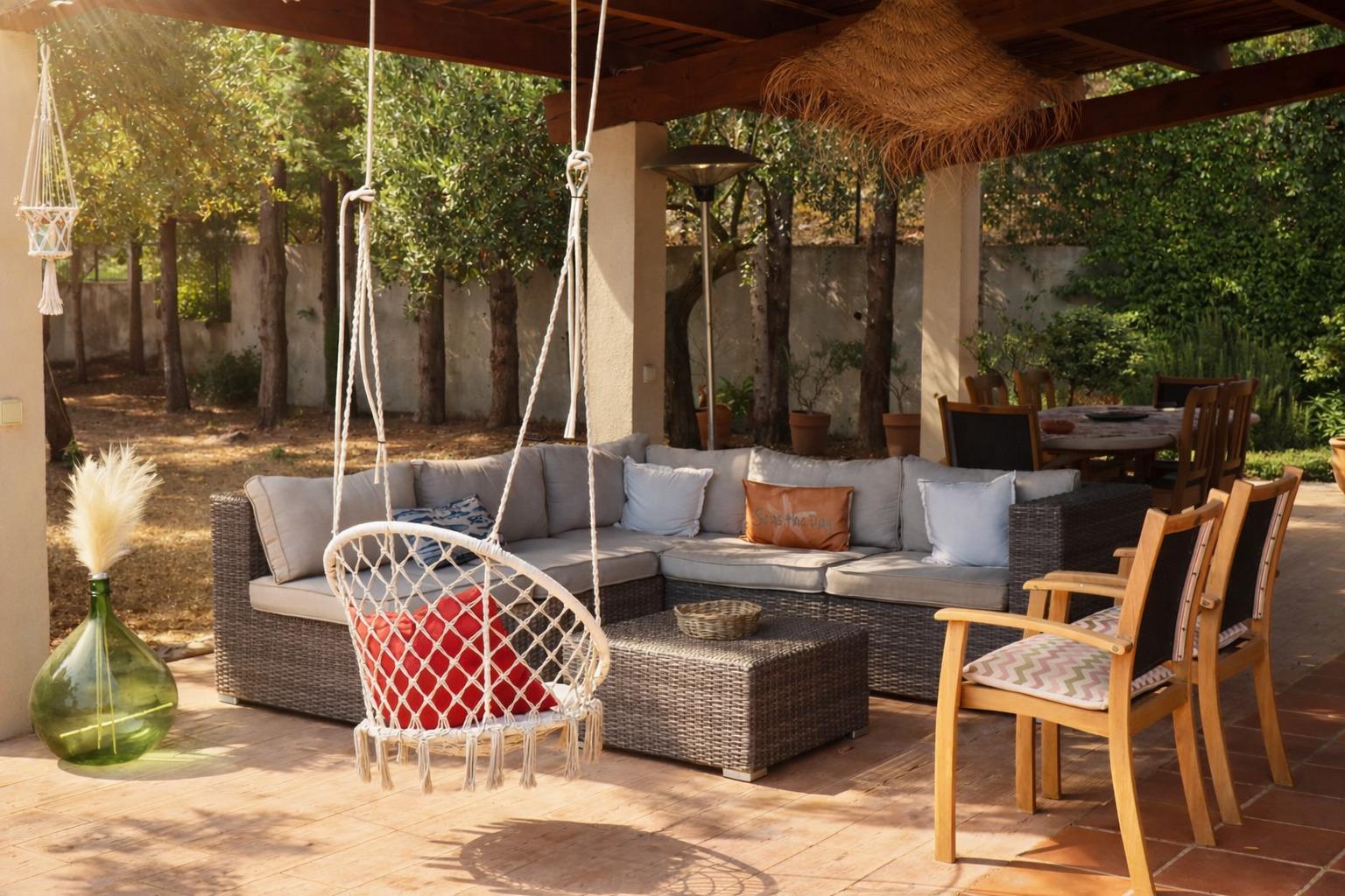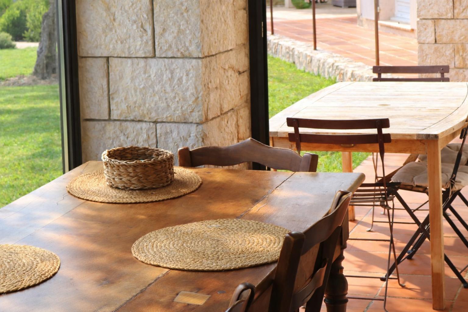 - Un lieu de vie extérieur couvert, bordé d'oliviers.