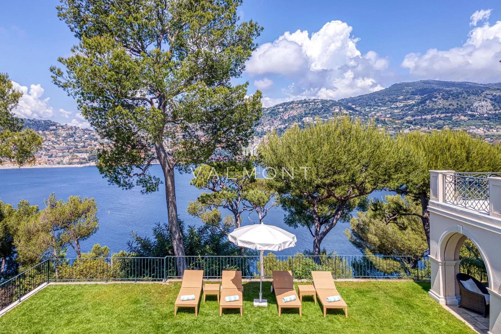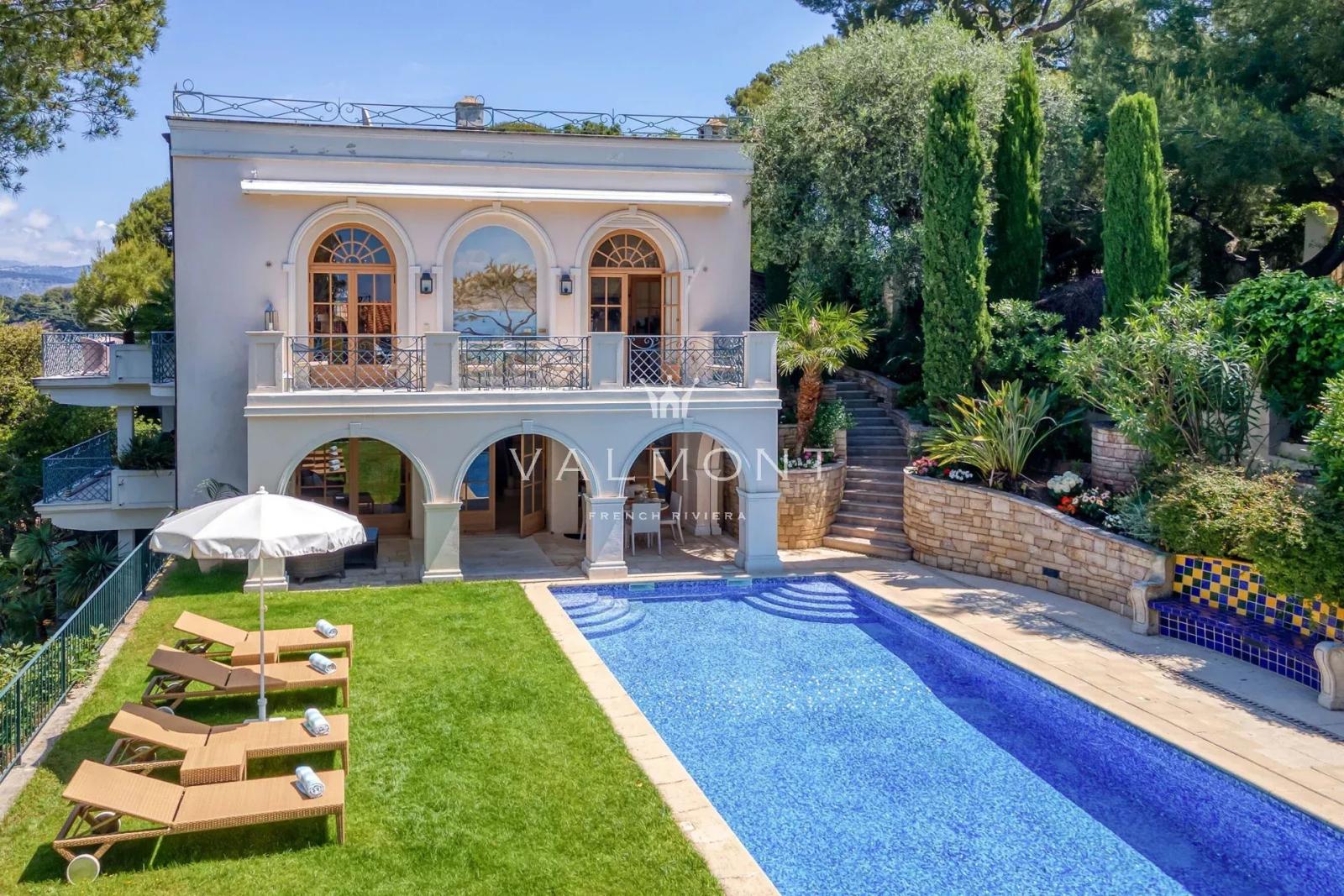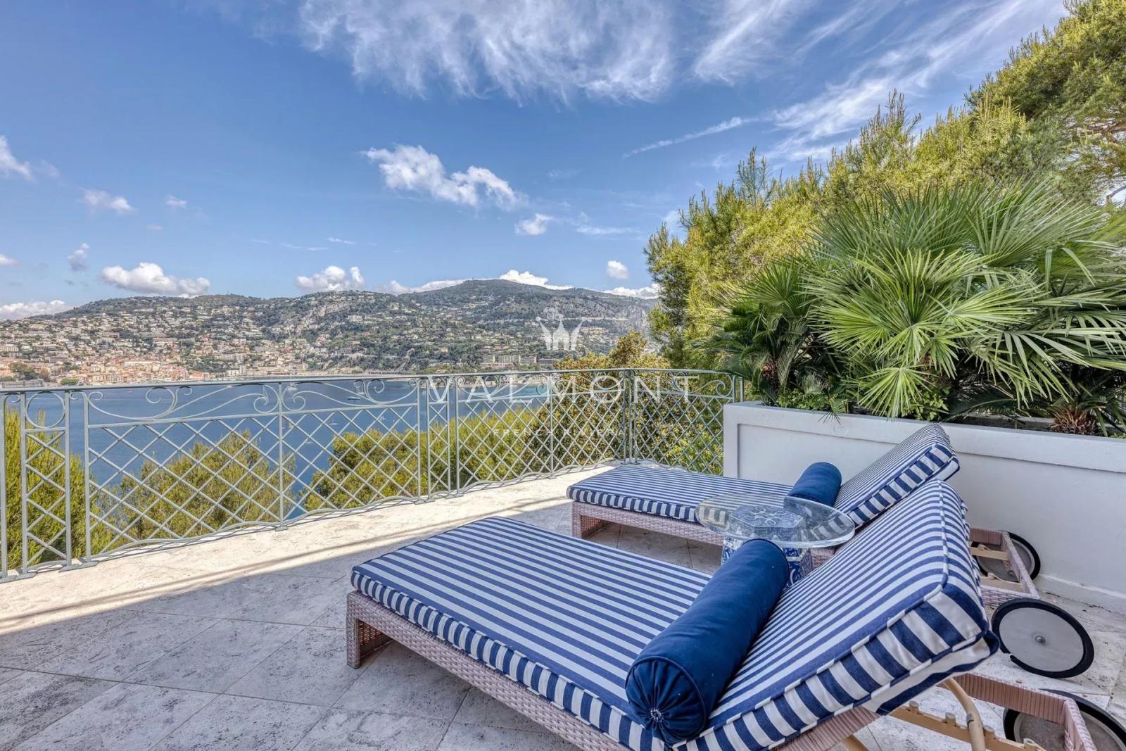 Les terrasses dévoilent une vue imprenable sur la mer et la baie de Villefranche. Le jardin, agrémenté d’une piscine, invite à la détente sous le ciel azuréen. Une porte discrète, en contrebas, permet un accès direct à la plage à pied.