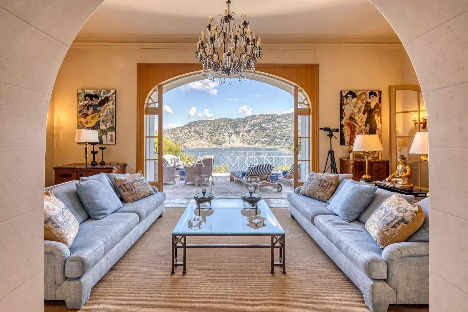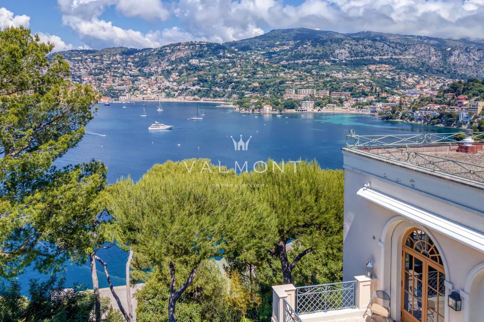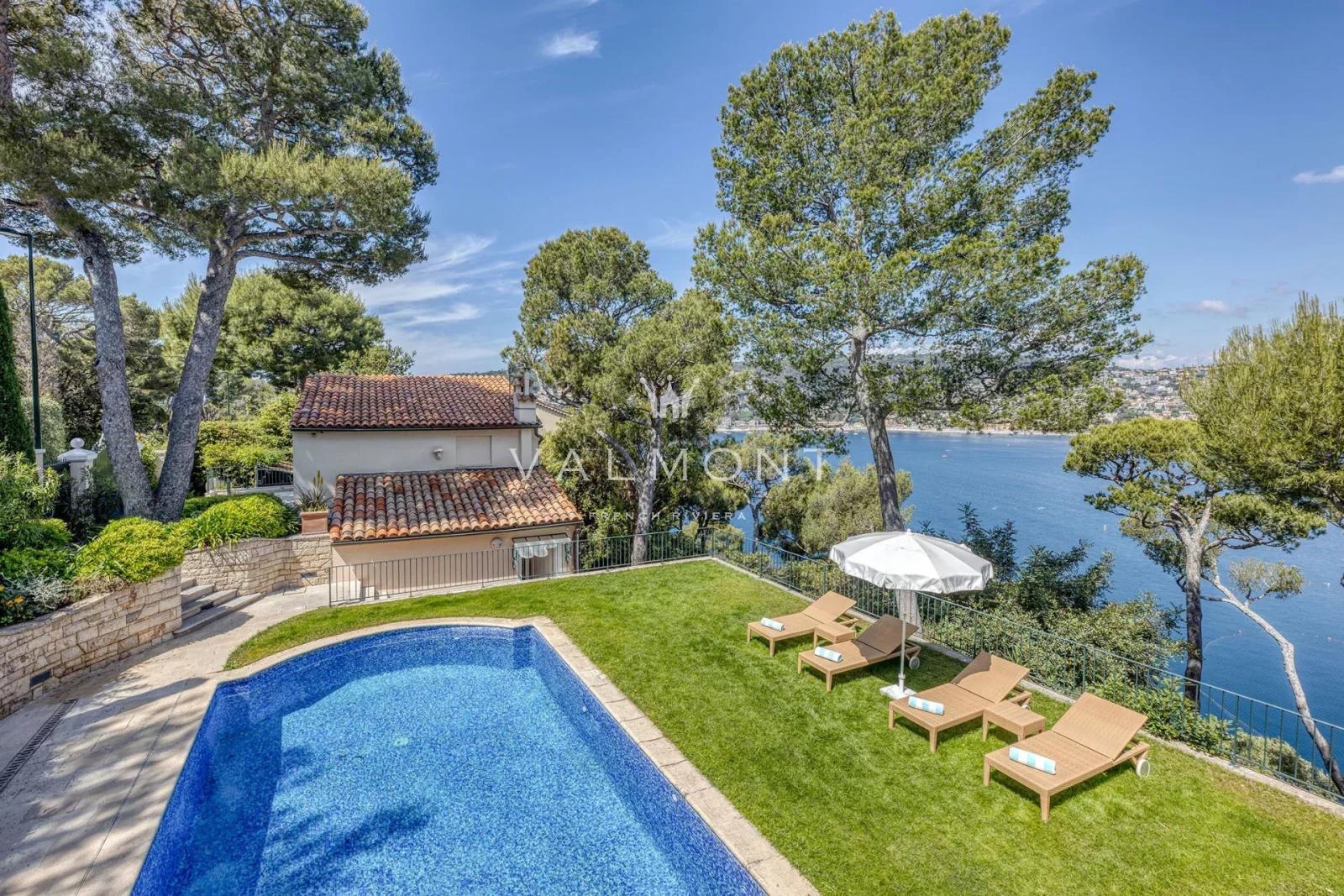 Les terrasses dévoilent une vue imprenable sur la mer et la baie de Villefranche. Le jardin, agrémenté d’une piscine, invite à la détente sous le ciel azuréen. Une porte discrète, en contrebas, permet un accès direct à la plage à pied.