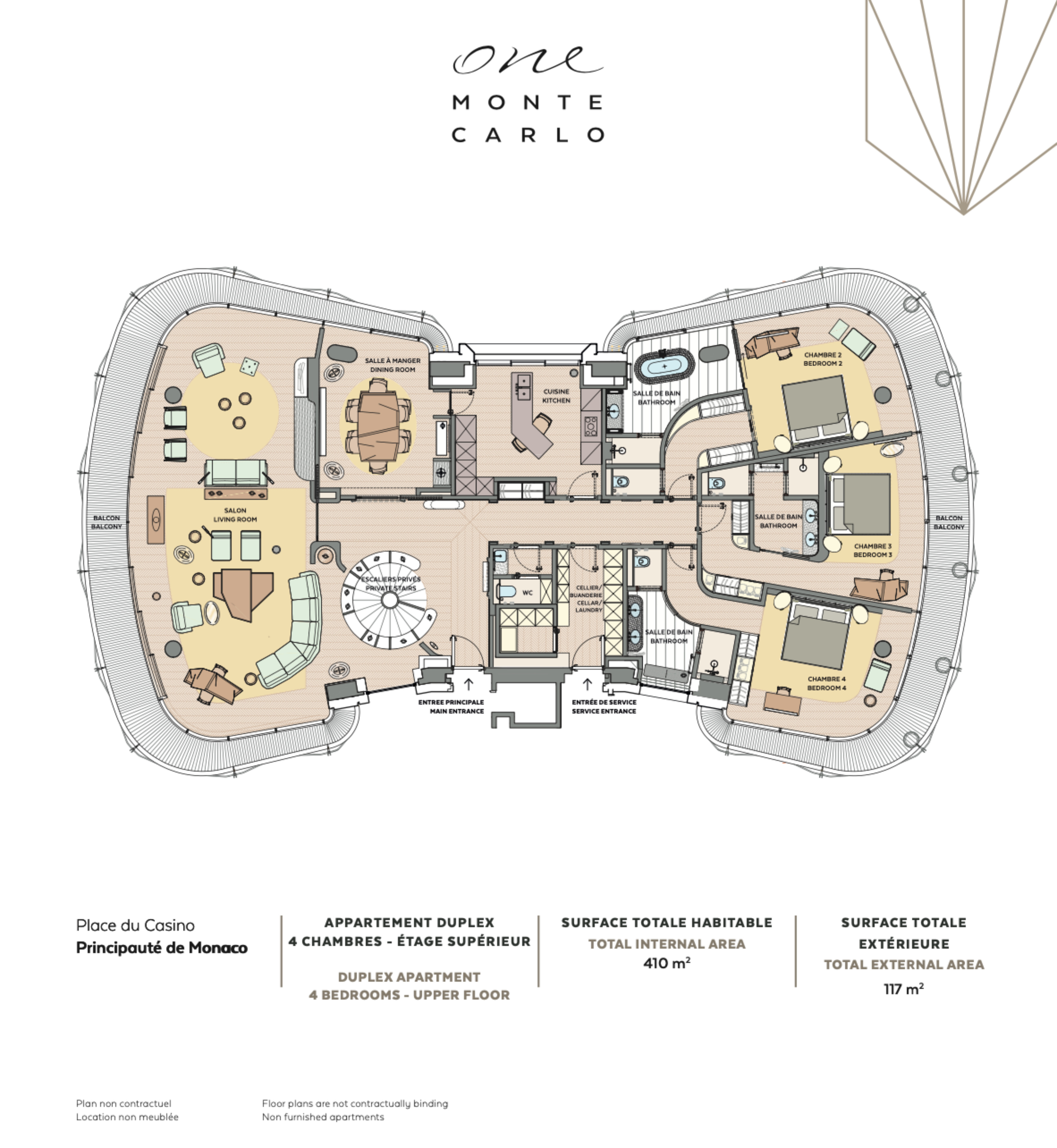 - au 4ème étage: un hall d'entrée donnant sur un salon avec vue sur le Casino et la mer, une salle à manger, une cuisine équipée séparée, 3 chambres avec salle de bain et dressing face à l'hôtel Hermitage, une entrée séparée pour le personnel avec une buanderie équipée et des toilettes invités.