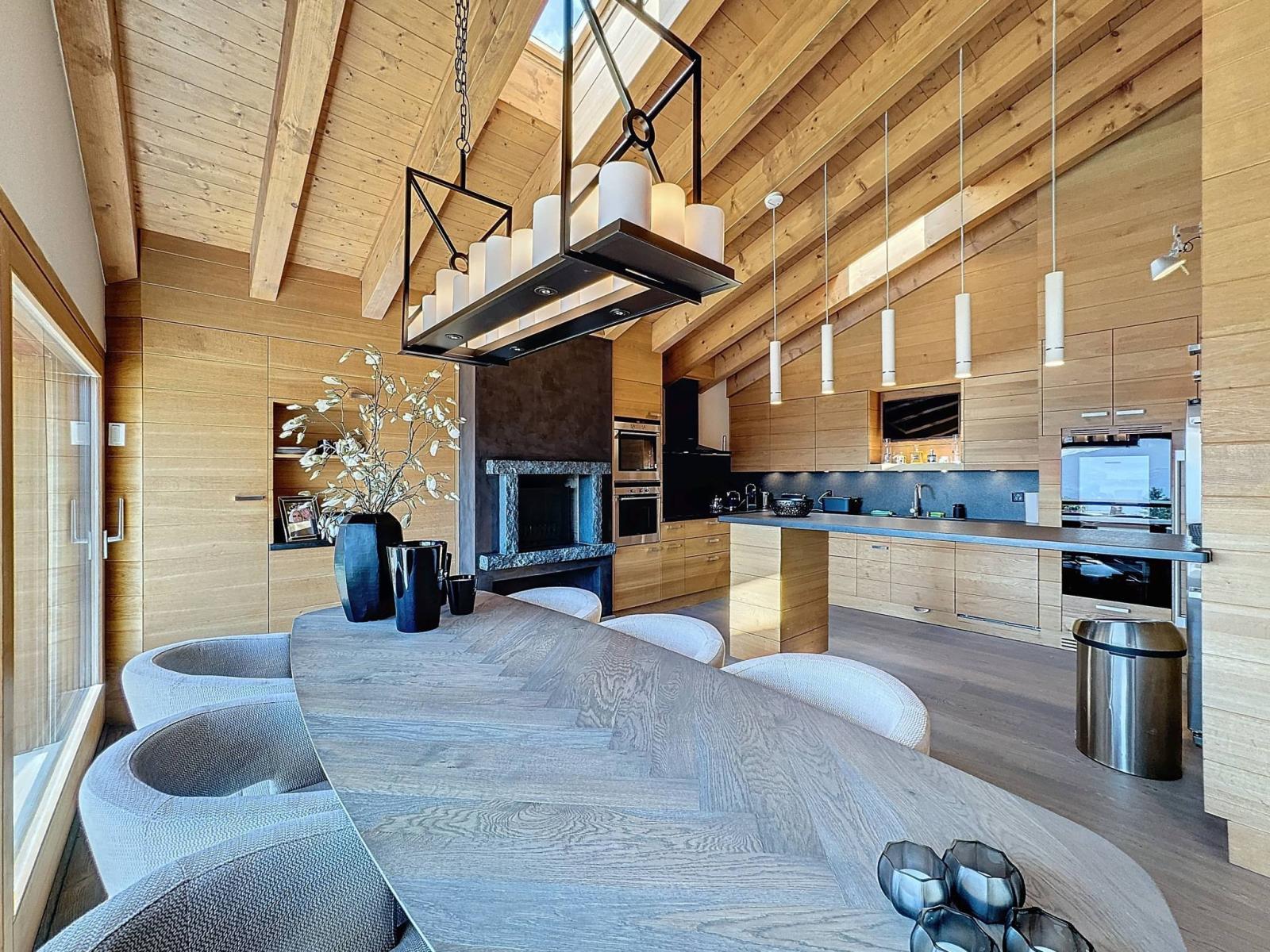 L’espace de vie se compose d’un vaste séjour avec salle à manger et d’une cuisine semi-ouverte, créant une atmosphère conviviale et fonctionnelle.
