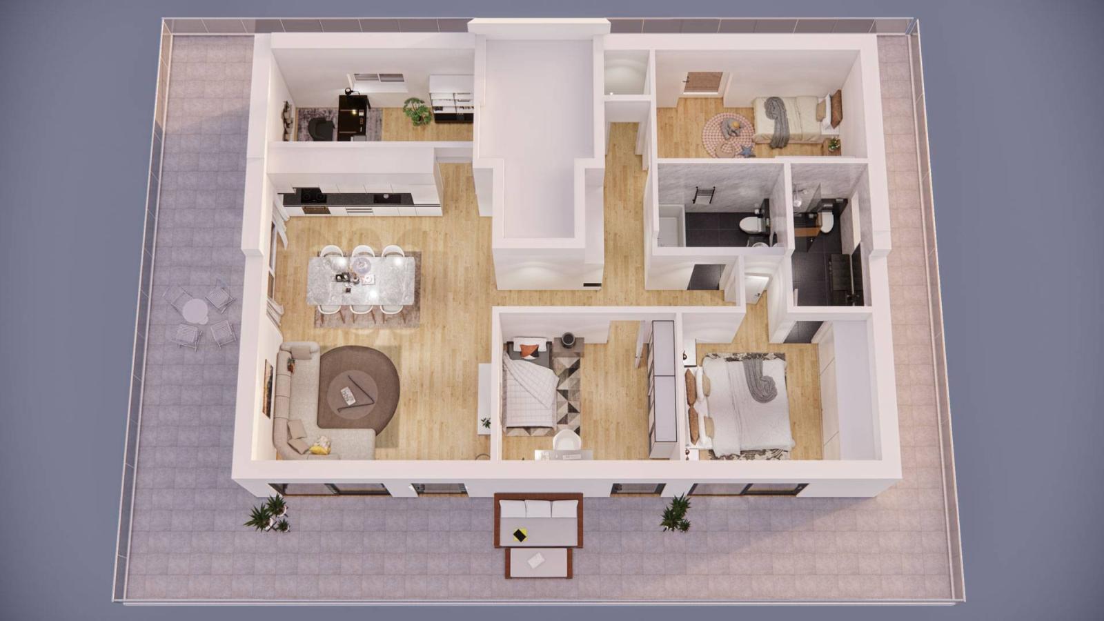 Dès l’entrée, le ton est donné avec un hall soigné intégrant des rangements discrets, qui conduit vers un vaste séjour avec cuisine ouverte. Cet espace de vie, baigné de lumière grâce à de larges ouvertures, constitue le cœur de l’appartement. Il invite aussi bien aux moments de convivialité qu’à la détente, dans une ambiance contemporaine et chaleureuse. La distribution des quatre chambres à coucher a été pensée pour préserver l’intimité de chacun, tout en offrant de belles possibilités d’aménagement, que ce soit pour une famille, un espace de travail ou des pièces dédiées aux invités.