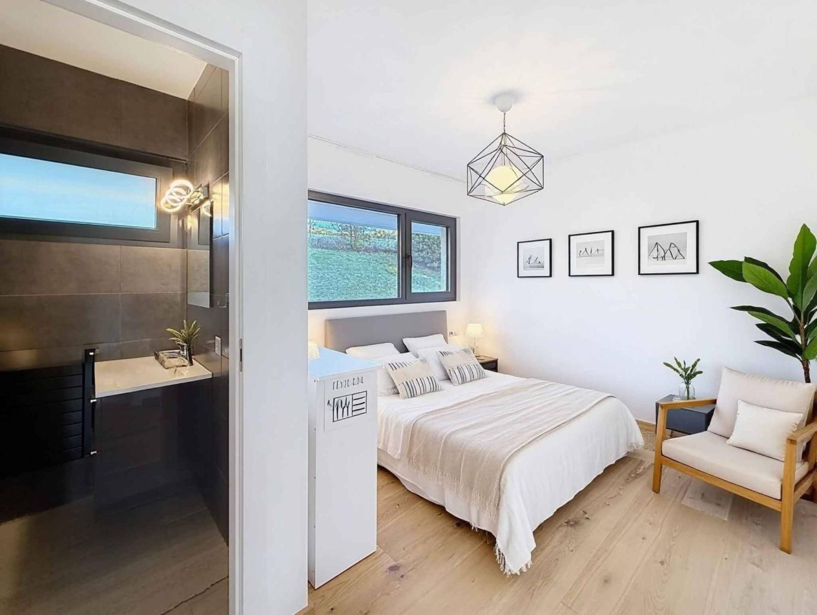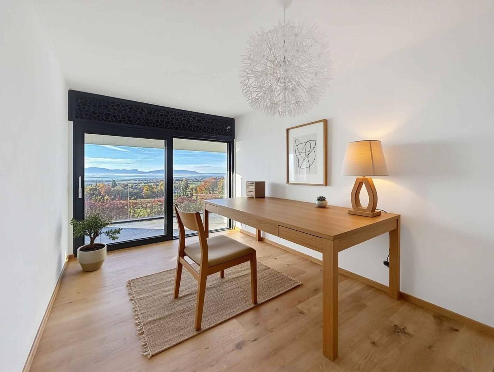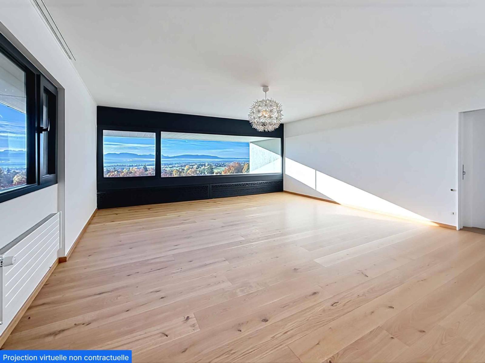 L'entrée s'ouvre sur un vaste couloir amenant à la première chambre qui peut également faire office de bureau, à une salle de bains avec douche et toilettes ainsi qu'à la terrasse orientée plein Sud.