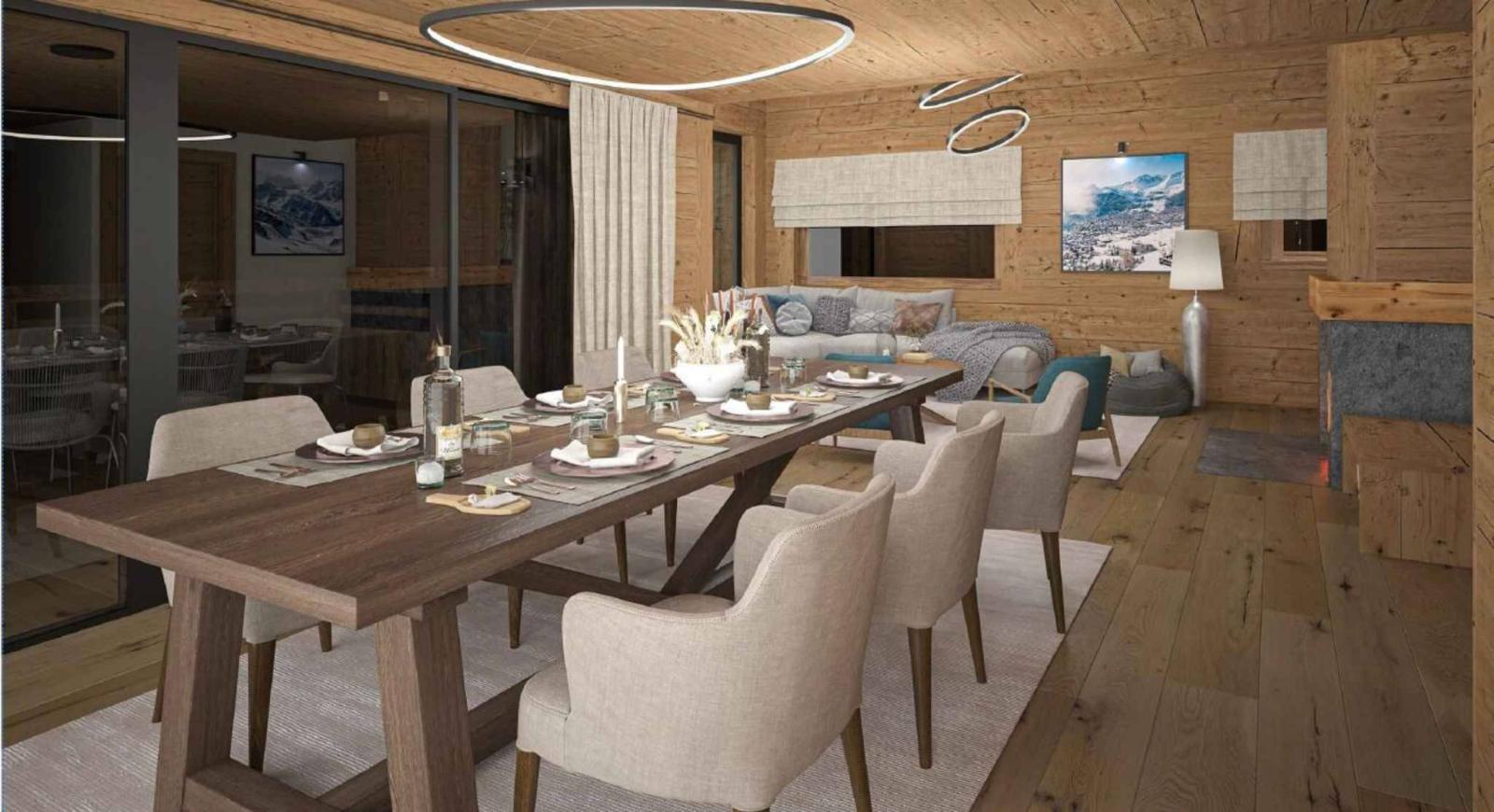 L’espace de vie, ouvert et convivial, s’étend vers un large balcon offrant une vue dégagée sur les montagnes environnantes. La cuisine moderne s’intègre naturellement à l’ensemble, créant un lieu idéal pour recevoir ou profiter du quotidien.