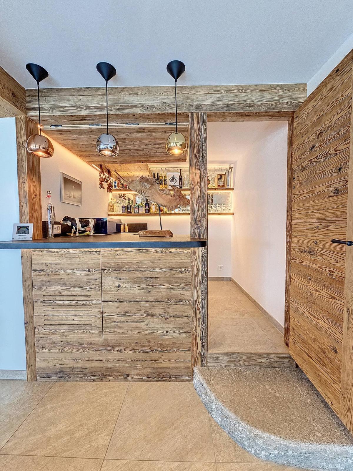 L’entrée se fait par un vaste local à skis et salle de jeux, équipé de chauffe chaussures et de nombreux rangements. Cet espace comprend également une table de billard et une buanderie privée attenante.