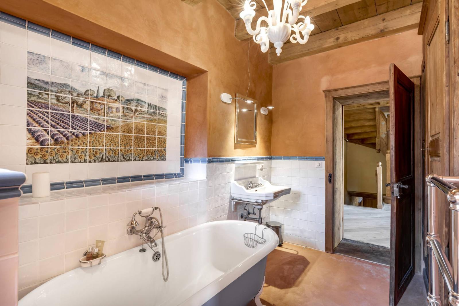 Le premier étage offre deux chambres avec mezzanines, un bureau, une grande chambre d’amis, une salle de douche, ainsi qu’un espace bien-être composé d’une grande salle de bain avec jacuzzi et d’un dressing généreux.