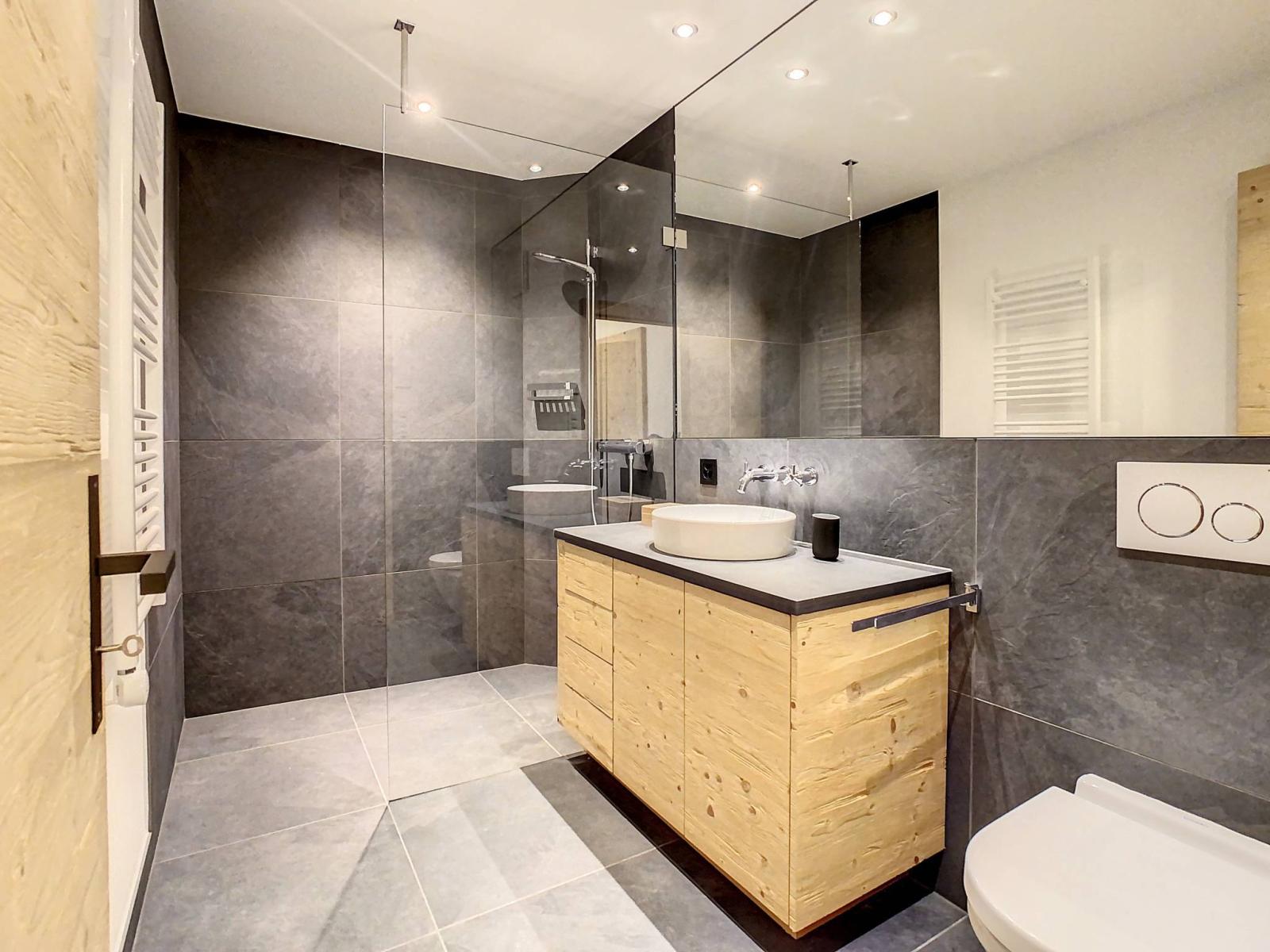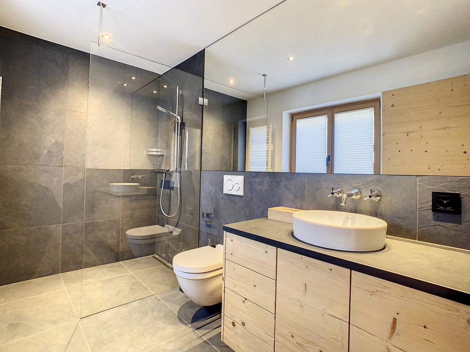 L’un des atouts majeurs du chalet est le jacuzzi extérieur, encastré dans une grande terrasse et offrant une vue panoramique sur le Grand et le Petit Combin – parfait pour se détendre après une journée sur les pistes. Un hammam avec douche est également à disposition pour prolonger les instants de bien-être.