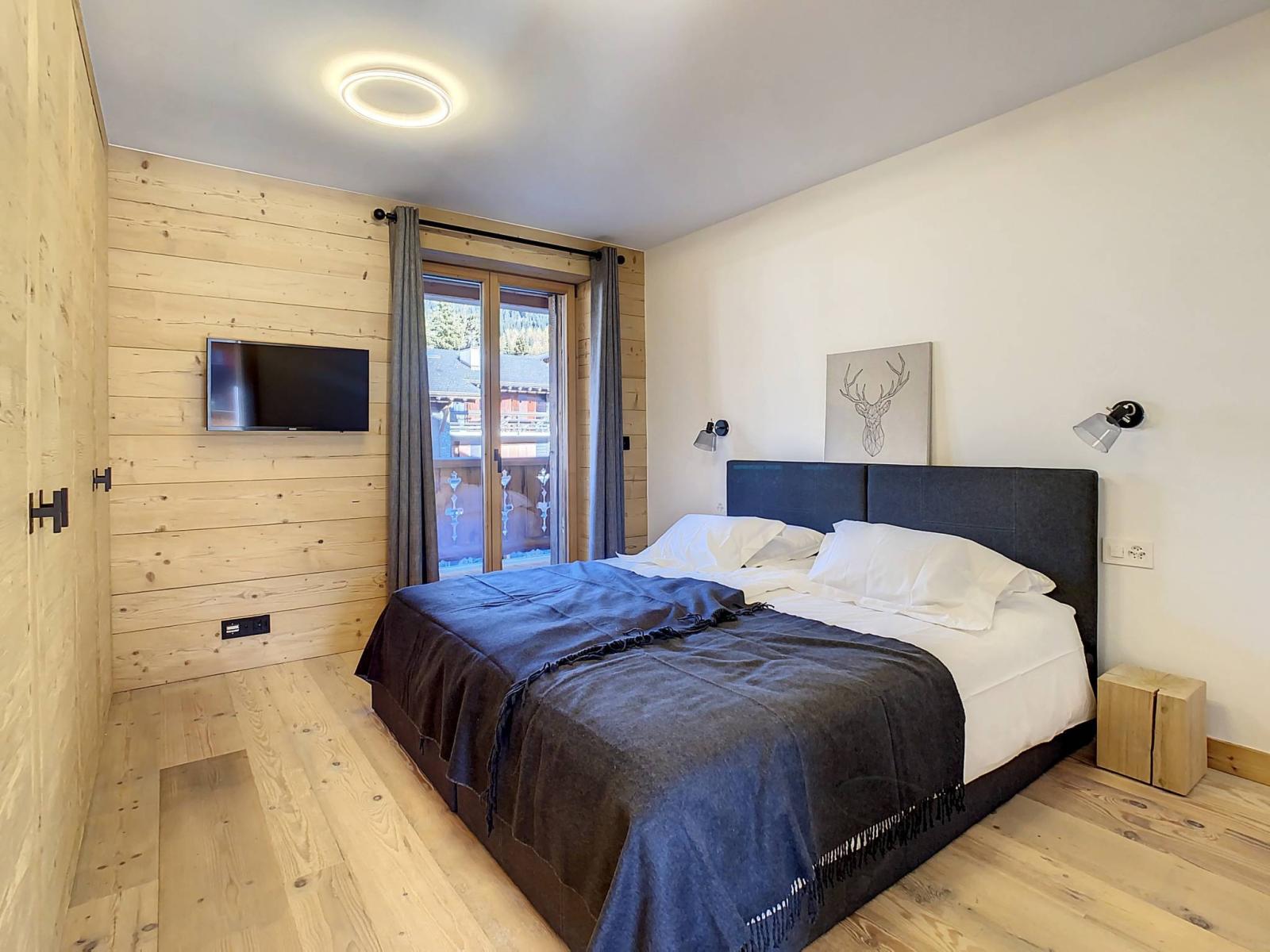 Enfin, le dernier étage abrite la suite parentale, nichée sous les combles. Elle dispose d’un balcon privé, d’un dressing traversant, d’une salle de bain avec douche séparée, et est aménagée avec goût. Deux autres chambres se trouvent également à ce niveau : une chambre double et une chambre avec lit queen-size, chacune avec sa propre salle de douche et une décoration unique empreinte de charme alpin.