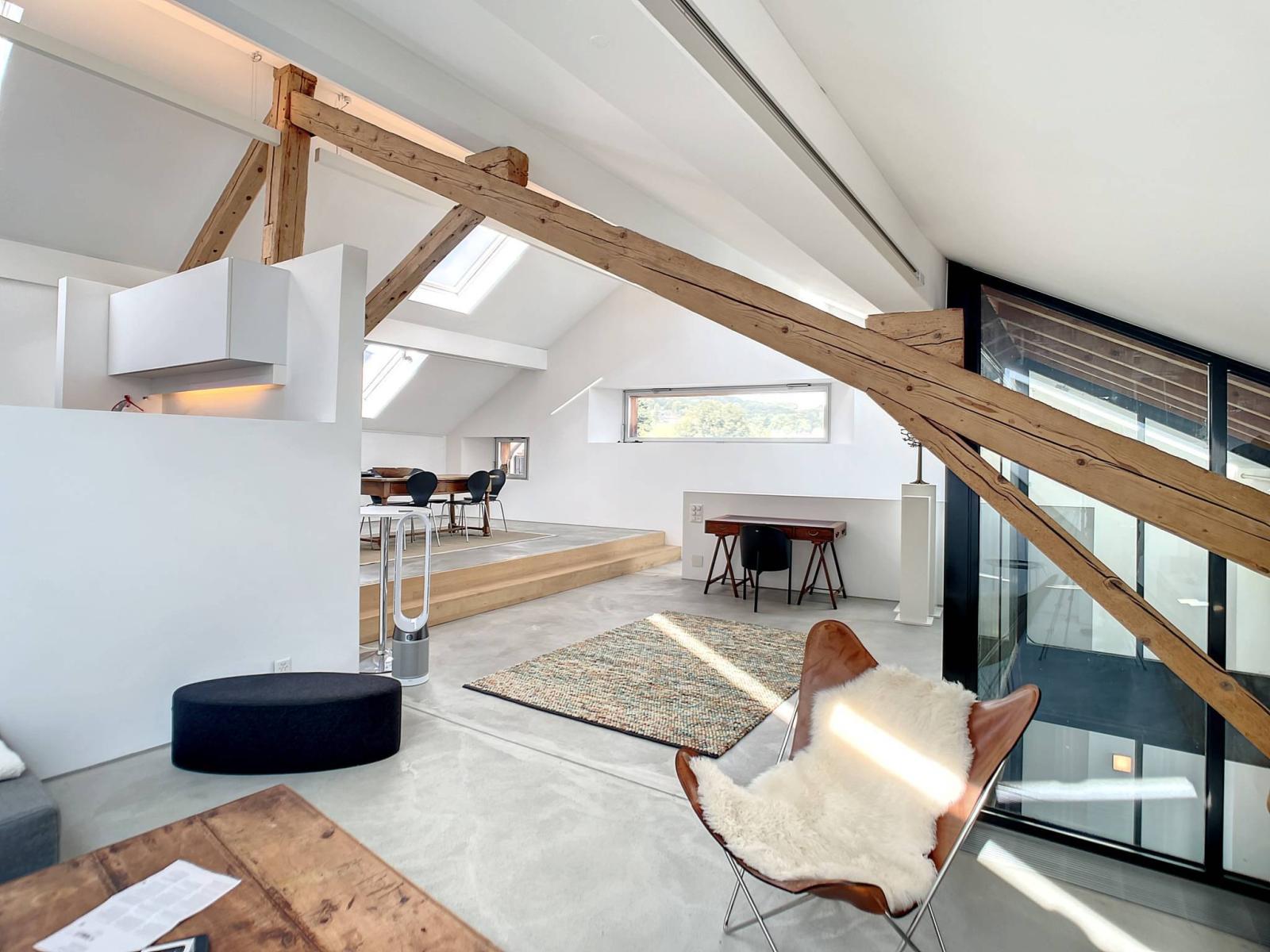 Le 2ème étage, pensé comme un loft, est sans nul doute l'attrait principal de cette propriété. Un magnifique plafond cathédrale et une mezzanine surplombent une grande pièce de vie. Du salon chaleureux avec sa cheminée fonctionnelle à la cuisine équipée ouverte sur la lumineuse salle à manger, le charme de la pièce est indéniable.