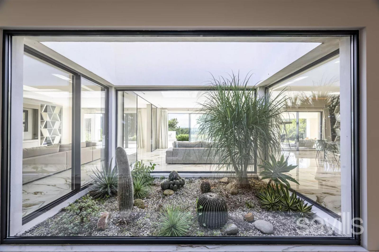 L’intérieur baigné de lumière, avec plafonds cathédrale et jardin zen vitré, crée une atmosphère apaisante. Salons, salle de billard et salle à manger s’ouvrent sur une vaste terrasse, fusionnant intérieur et extérieur. La cuisine en marbre avec équipements italiens ravira les amateurs de gastronomie.