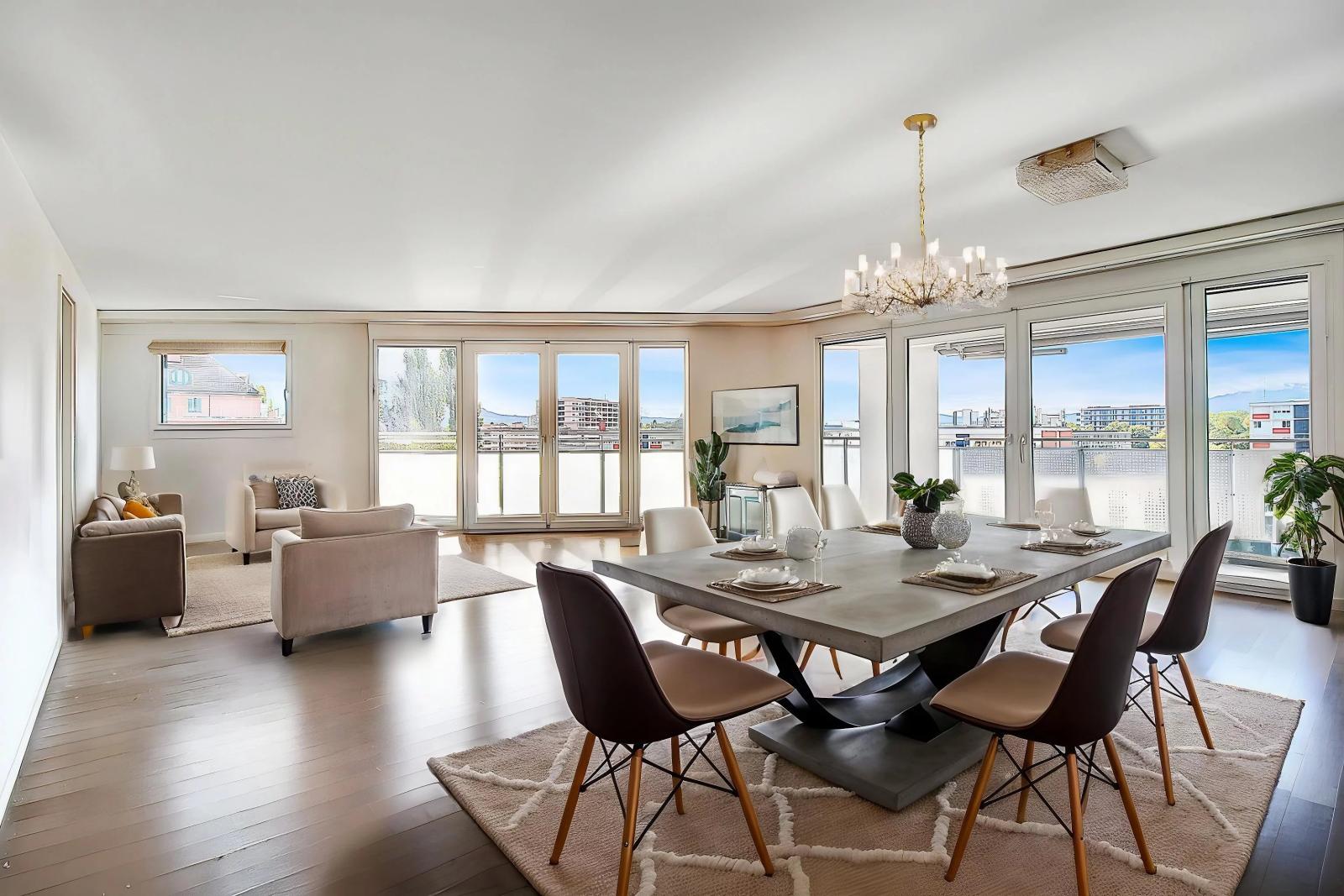 Idéalement situé dans le quartier résidentiel et recherché de Saint-Jean, dans une résidence récente et sécurisée, ce splendide duplex de 264 m² PPE, occupe les derniers étages et bénéficie d’un accès privatif par ascenseur. Son emplacement dominant offre une vue dégagée et imprenable sur Genève et ses environs.